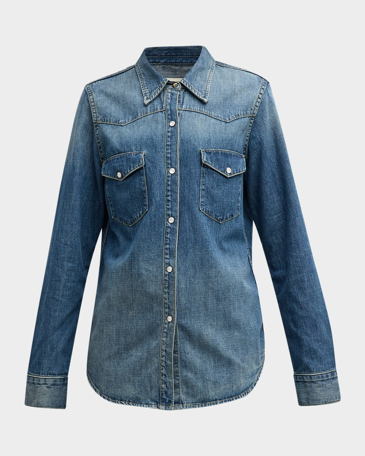 Nili Lotan "Travis" denim western shirt featuring front and back yokes Point collar; snap front Long sleeves; snap cuffs Chest snapflap pockets Relaxed fit Shirttail hem Cotton Made in USA