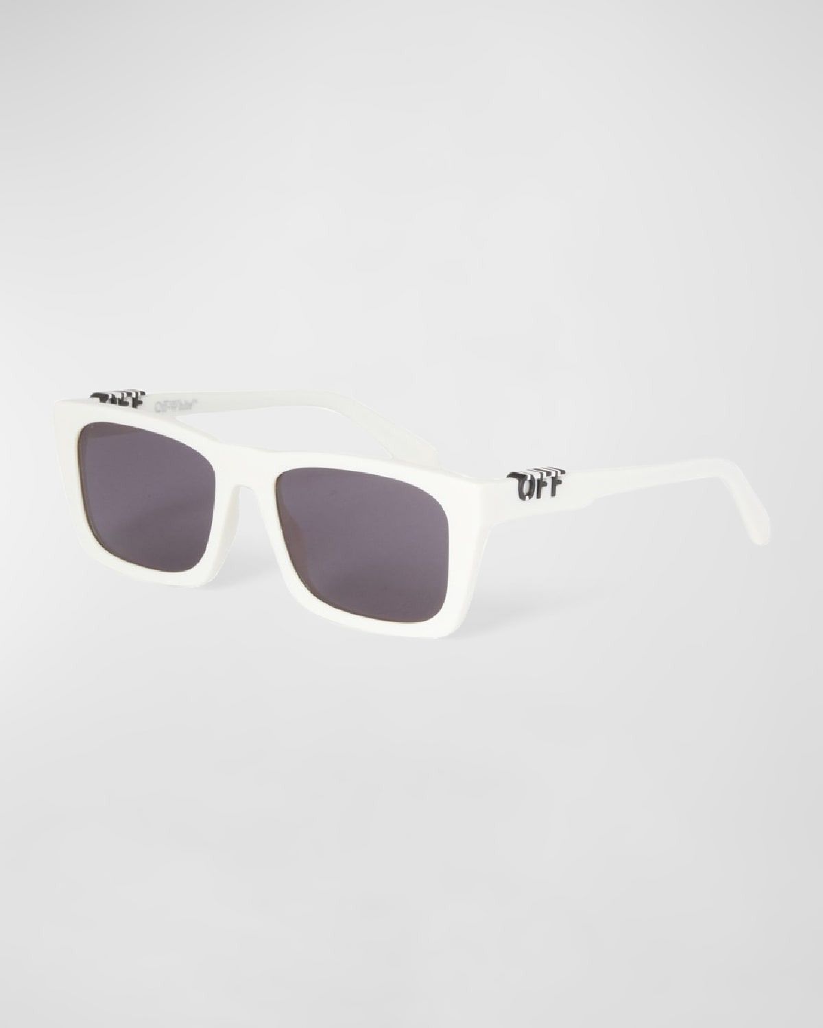 - Off-White "Albany" rectangle sunglasses in acetate - Lens/bridge/temple (in mm): - 56-18-145 - Solid-color lenses - Saddle nose bridge - Logo hardware on the temples - Thin, tapered arms - Curved temple tips - Acetate - 100% UVA/UVB protection - Made in Italy - Proposition 65 warning for California residents