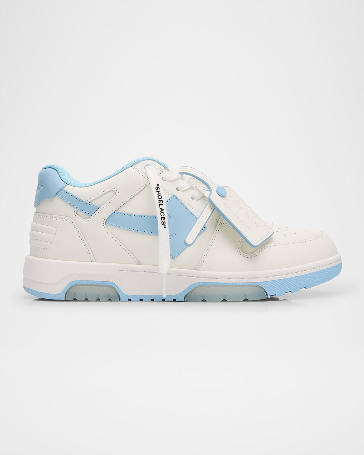 - Off-White "Out of Office" low-top sneakers in two-tone leather - Flat heel - Round toe - Lace-up style - Signature arrow applique on sides - Signature leather tag on sides - Rubber outsole - Whole sizes only; for 1/2 sizes, order next size down. - Imported