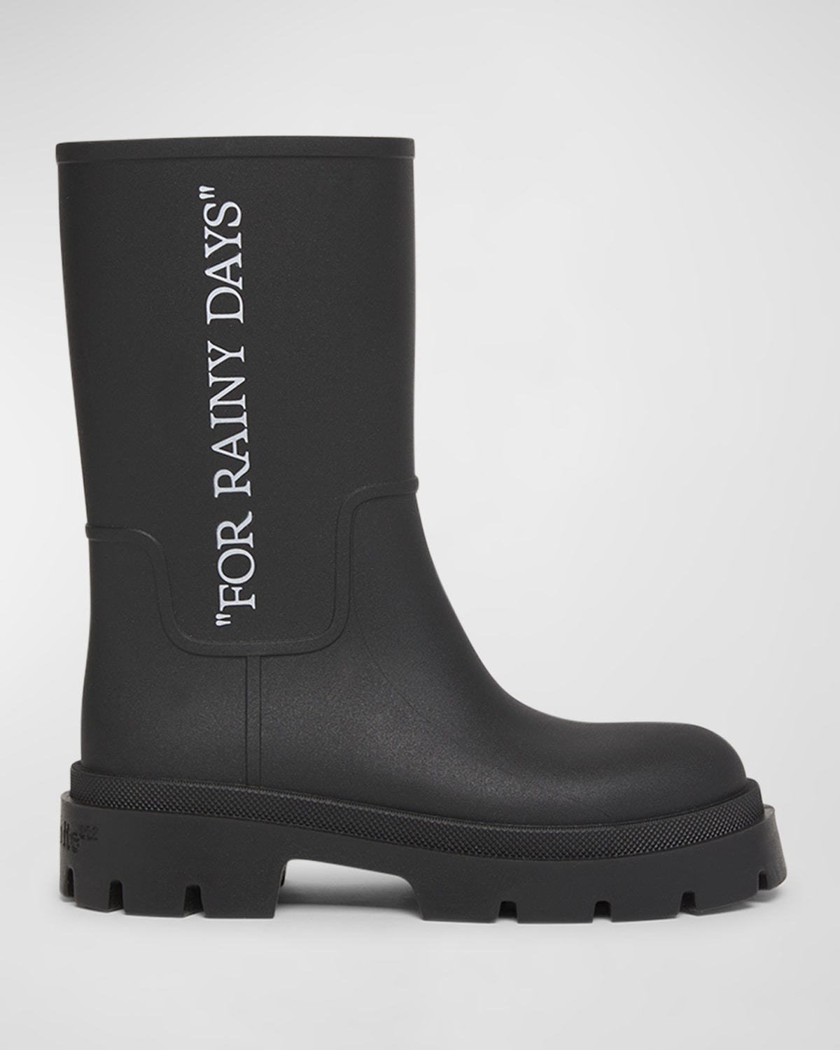 - Off-White "Reboot" rain boots in PVC with "FOR RAINY DAYS" on sides - 0.50 in / 15 mm flat heel - Round toe - Mid-calf - Pull-on style - Lining: Polyester - Made in Italy - Proposition 65 warning for California residents