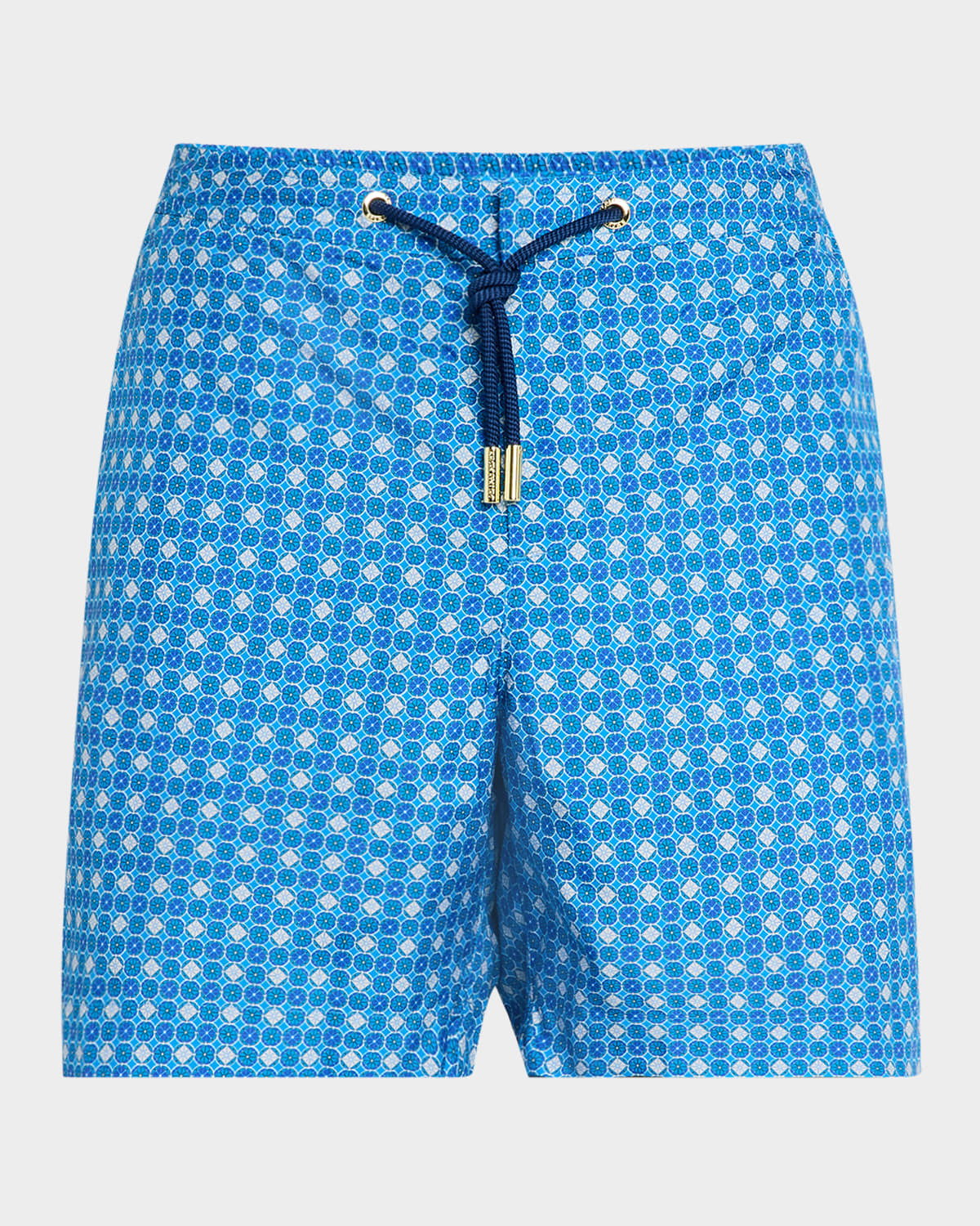 - Orlebar Brown "Bulldog Dahlia" swim shorts in intricate geometric print - Approx. 6" inseam - Elasticized drawcord waist - Elegant gold-tone eyelets and drawcord ends - Side slip pockets - Single back zip pocket - Polyester - Lining: Nylon - Machine wash cold - Made in Portugal