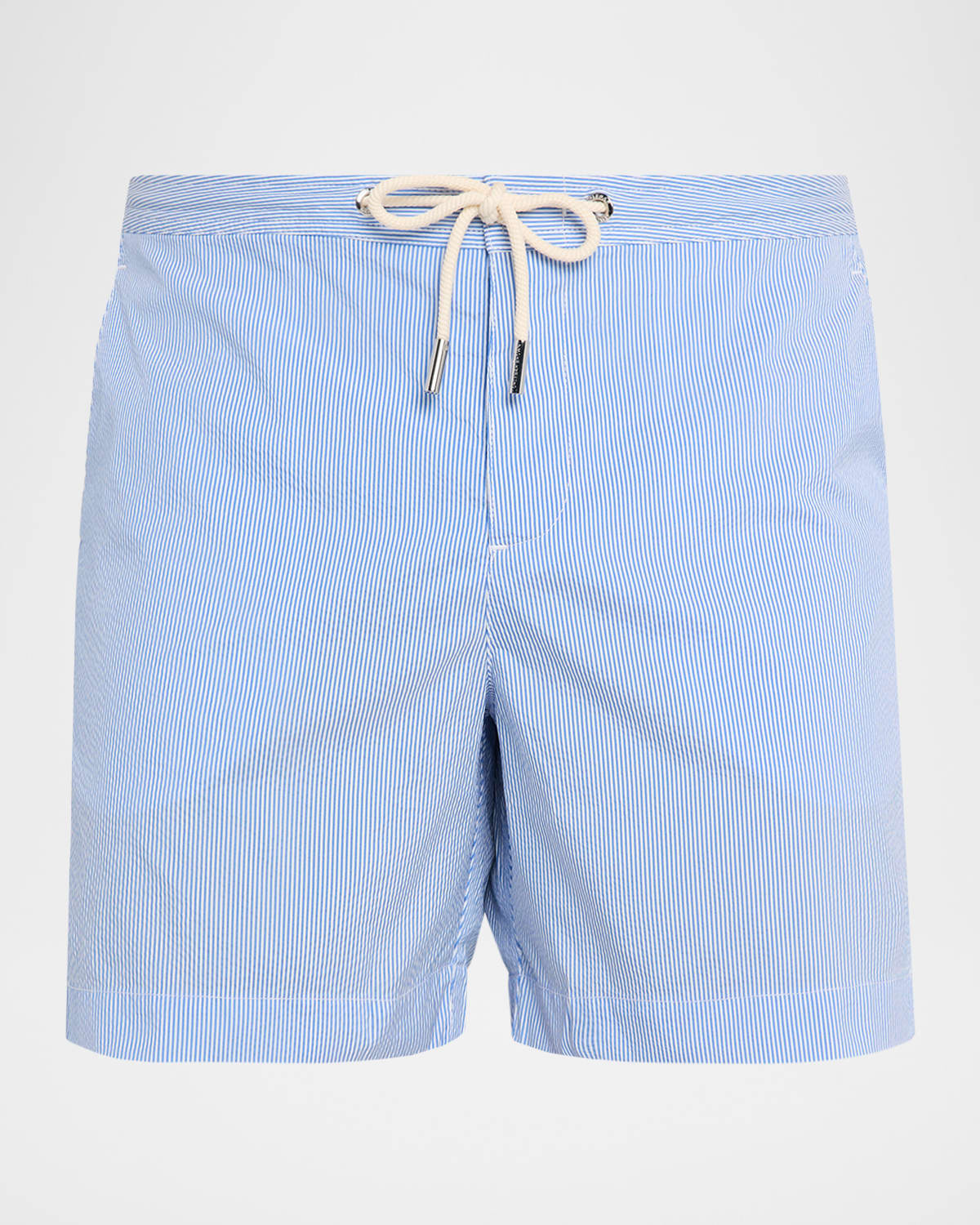 - Orlebar Brown "Bulldog" swim shorts in quick-dry stripe seersucker - Inseam approx. - 6 inches - Regular rise - Side slip pockets - Back zip pocket - Classic fit - Concealed snap closure - Elasticated drawcord waistband - Branded nickel-effect eyelets & cord ends - Polyester - Lining: Mesh/nylon - Machine wash cold - Made in Portugal
