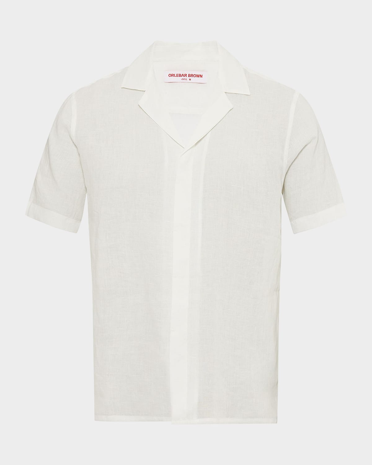 - Orlebar Brown "Maitan" camp shirt made from soft, laundered linen - Notched collar - Concealed button placket - Short sleeves - Relaxed fit - Signature stripe detail at left hem - Dry clean - Made in Portugal - Model is 6'1"/185cm.