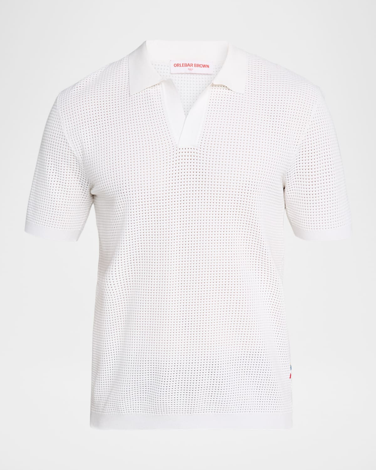 - Orlebar Brown "Roddy" polo shirt features open mesh stitching for an attractive, luxe texture - Resort placket - Short sleeves - Classic fit - Hand embroidered O.B stripe branding at side seam - Viscose/polyester - Dry clean - Made in Italy - Model is 6'1"/185cm.