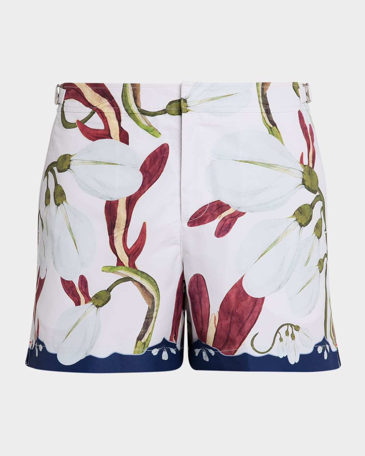- Orlebar Brown "Setter" swim shorts in quick-dry fabric displaying Orchis artwork - Inseam approx. - 4.5 inches - Regular rise - Side slip pockets - Classic fit - Shorter length - Snap-zip fly - Adjustable branded waistband adjusters - Polyester - Lining: Mesh/nylon - Machine wash cold - Made in Portugal