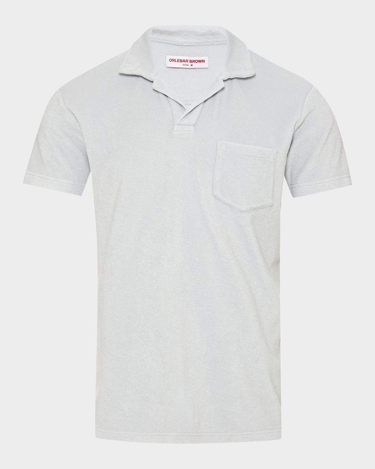 - Orlebar Brown polo shirt in soft, absorbent terry toweling fabric - Open collar - Chest patch pocket - Short sleeves - Pullover style - Cotton - Machine wash cold - Made in Portugal - Model is 6'1"/185cm.