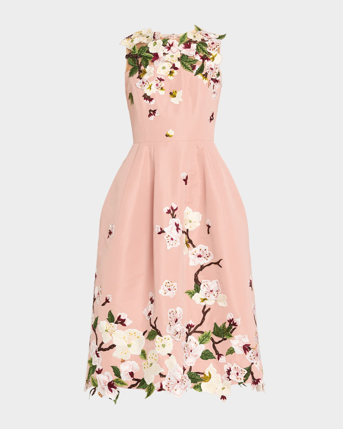 - Oscar de la Renta faille cocktail dress embellished with degrade cherry blossom embroidery along the neck and hem - High neckline - Sleeveless - Pleated skirt - Tea length - A-line silhouette - Zip closure - Nylon/polyamide/polyester/silk - Unlined - Dry clean - Made in Italy