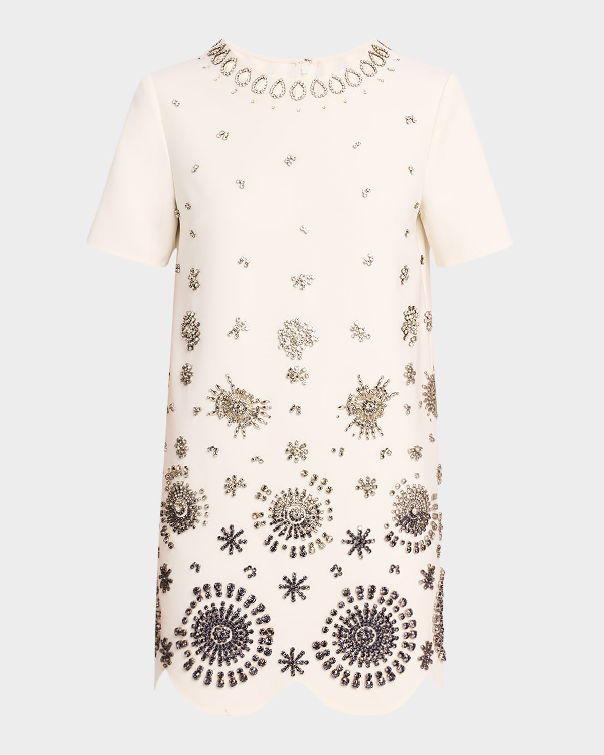 - Oscar de la Renta stretch wool cocktail dress featuring crystal cutout embellished neck and a degrade crystal embroidered front - Round neckline - Short sleeves - Shift silhouette - Mini length - Scalloped hem - Zip closure - Virgin wool/elastane/nylon/polyamide - Unlined - Dry clean - Imported