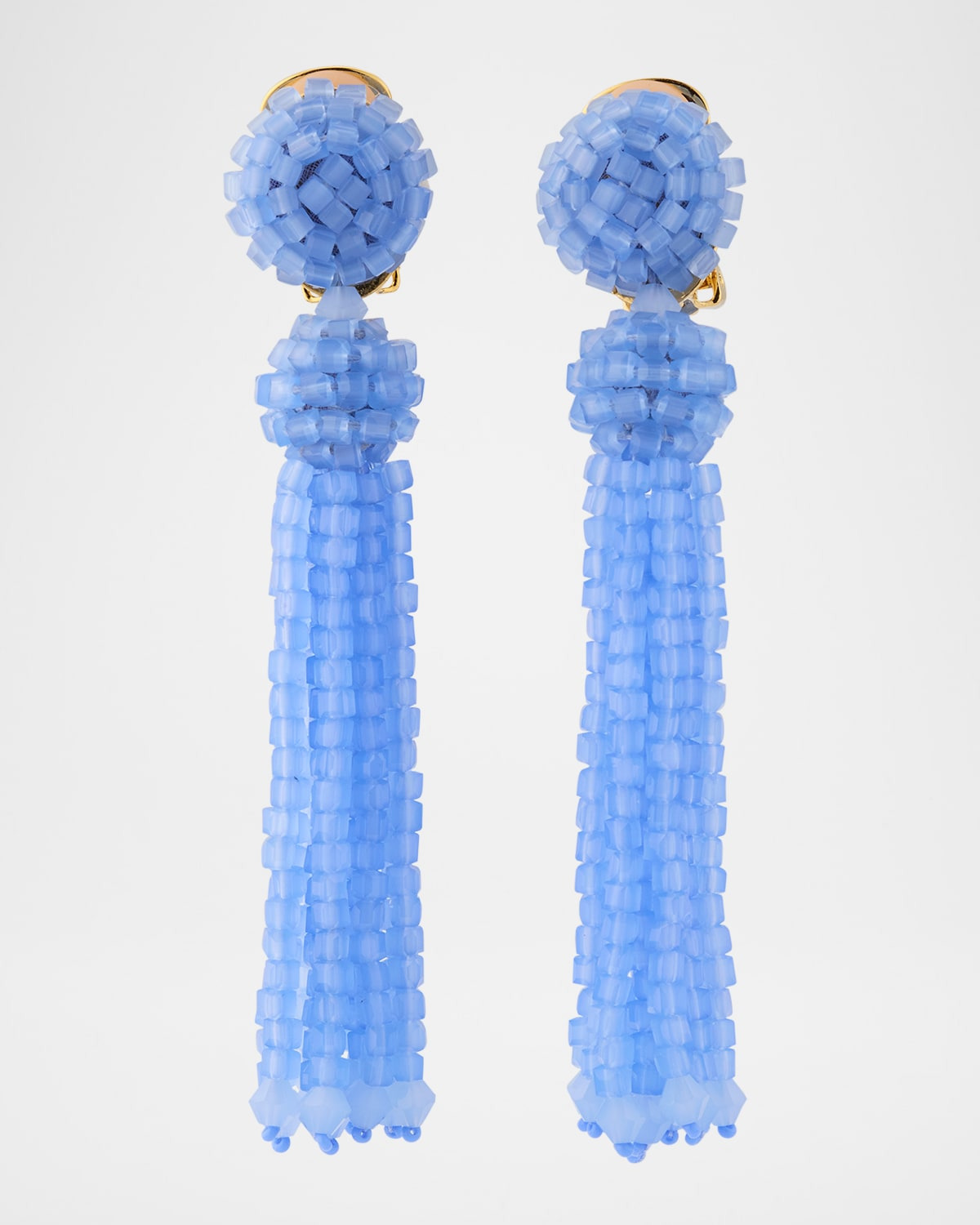 - Glass beads are strung and gathered for these Oscar de la Renta tassel earrings. - Approx. 3.3" length - 24-karat gold-plated brass - Glass beads, polyester, and PVC sequins - Clip-on backs - Imported