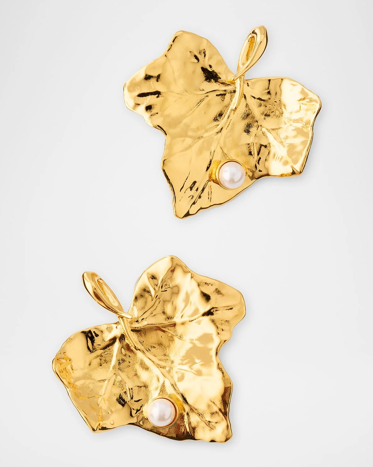 Sculpted to resemble resilient ivy leaves, Oscar de la Renta finishes these clipon earrings with a touch of white pearly bezels. Approx. 1.9" length x 1.9" width Shiny goldtone brass Plastic pearly beads Clipon backs Made in Italy
