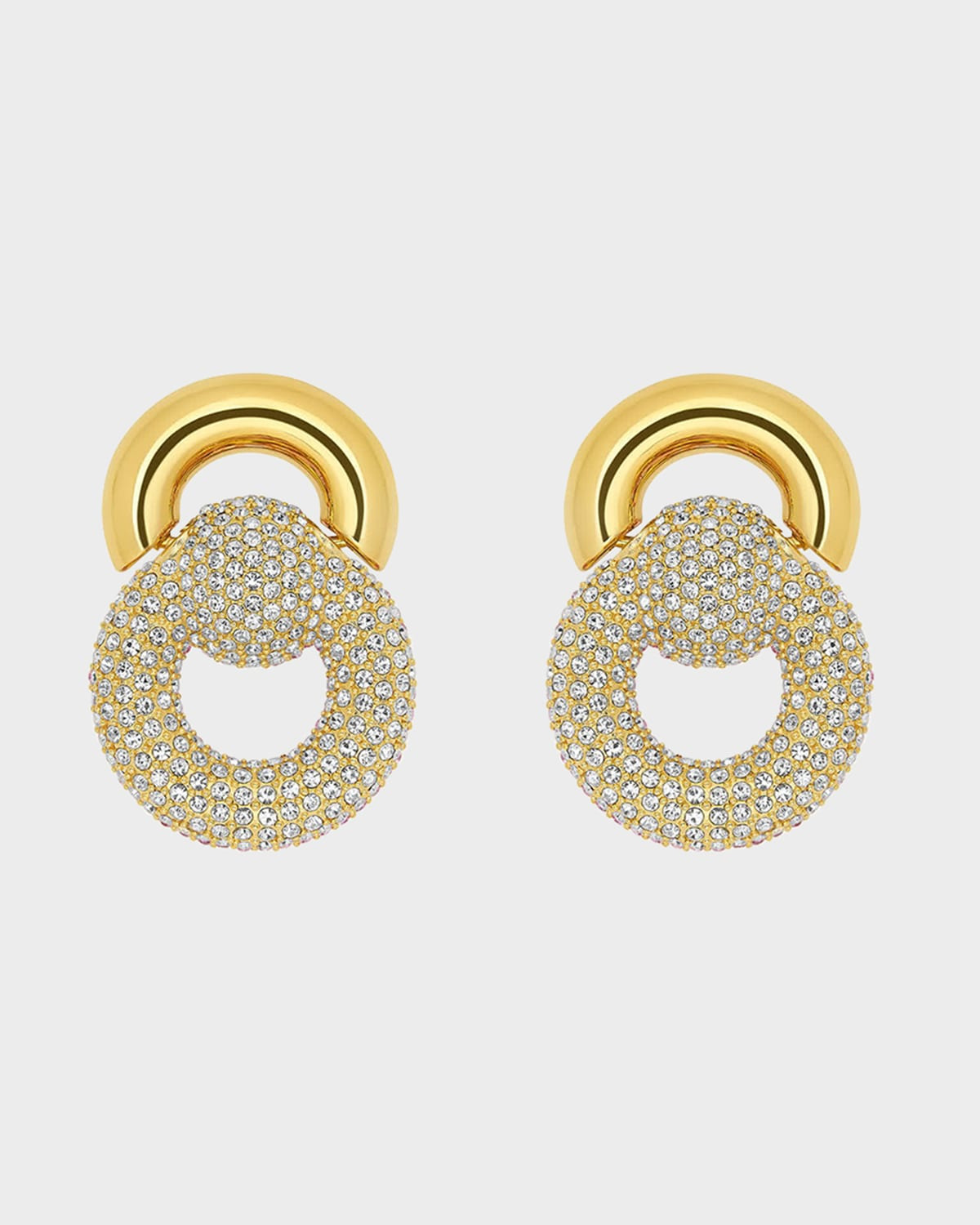 - These statement earrings from Oscar de la Renta resemble the classic door knocker silhouette. Pave crystals cover the bottom half of the earring. - Approx. 1.7" length - 24-karat gold-plated brass - Glass crystals - Clip-on backs - Made in Italy