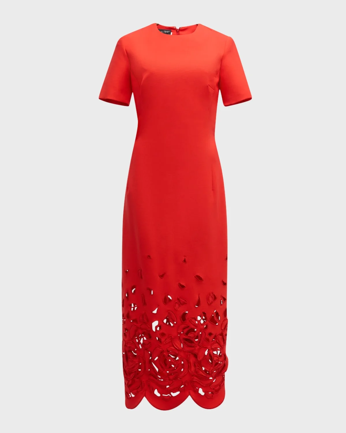 Oscar de la Renta stretch wool dress featuring rose cutout details and a scalloped hem Round neckline Short sleeves Sheath silhouette Hem falls below the knee Centerback slit hem Zip closure Virgin wool/elastane/nylon/polyamide Lining: Silk Dry clean Made in Italy