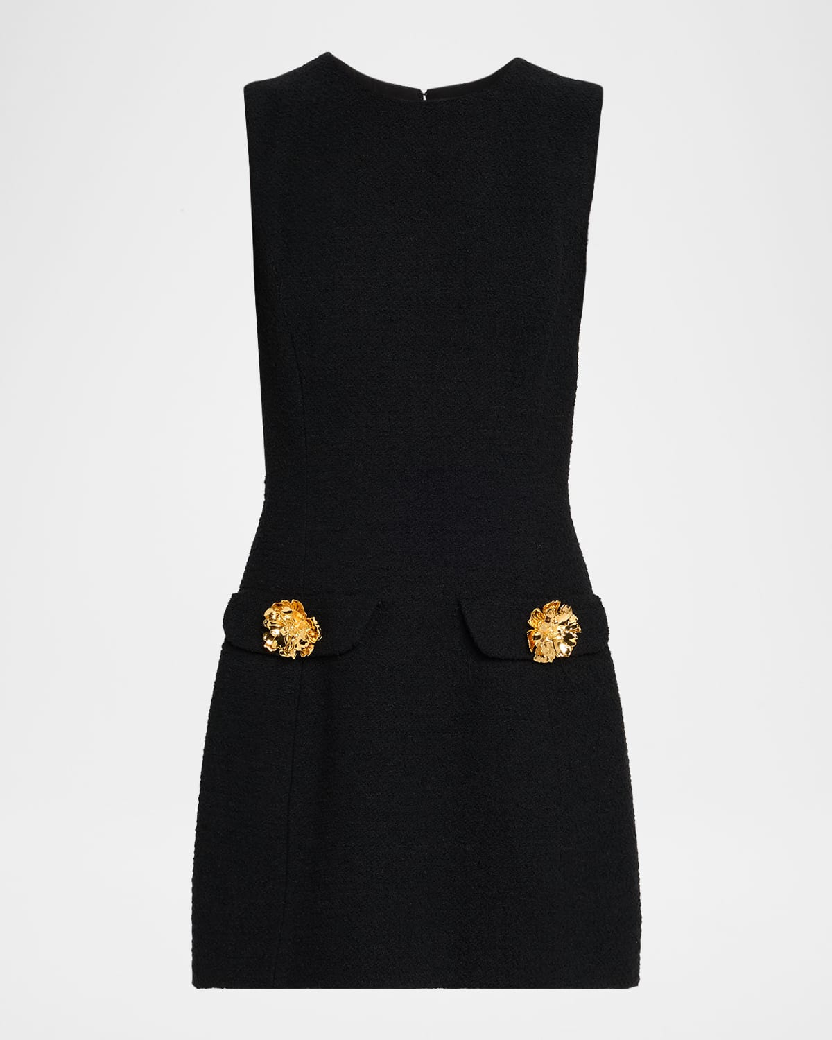 - Oscar de la Renta tweed day suit dress featuring goldtone flower embellished pockets - Round neckline - Sleeveless - Sheath silhouette - Mini length - Zip closure - Cotton/virgin wool/nylon/polyamide - Dry clean - Made in Italy