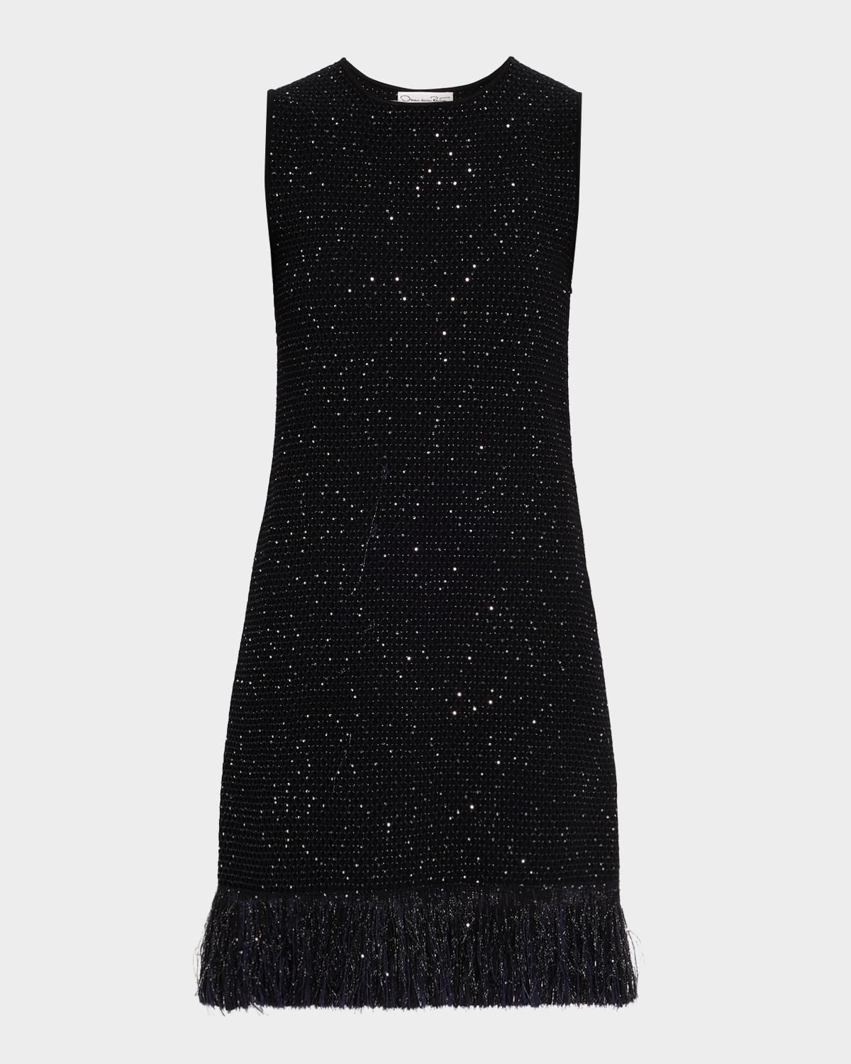 - Oscar de la Renta paillette textured tweed dress finished with a fringe hem - Round neckline - Sleeveless - Shift silhouette - Mid-thigh length - Zip closure - Viscose/polyester/silk - Dry clean - Made in Italy