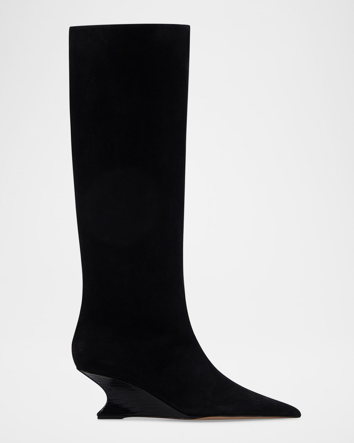 - Paris Texas "Nina" suede knee-high boots - 2.00 in / 50 mm wedge heel - Pointed toe - Pull-on style - Leather outsole - Lining: Leather - Made in Italy
