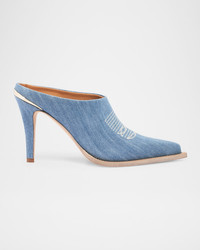 - Partlow "Lainy" denim western mule pumps with contrast stitch detailing - 3.75 in / 95 mm stiletto heel - Pointed toe - Slide style - Logo-embossed metal heel insert - Leather outsole - Lining: Leather - Made in Italy