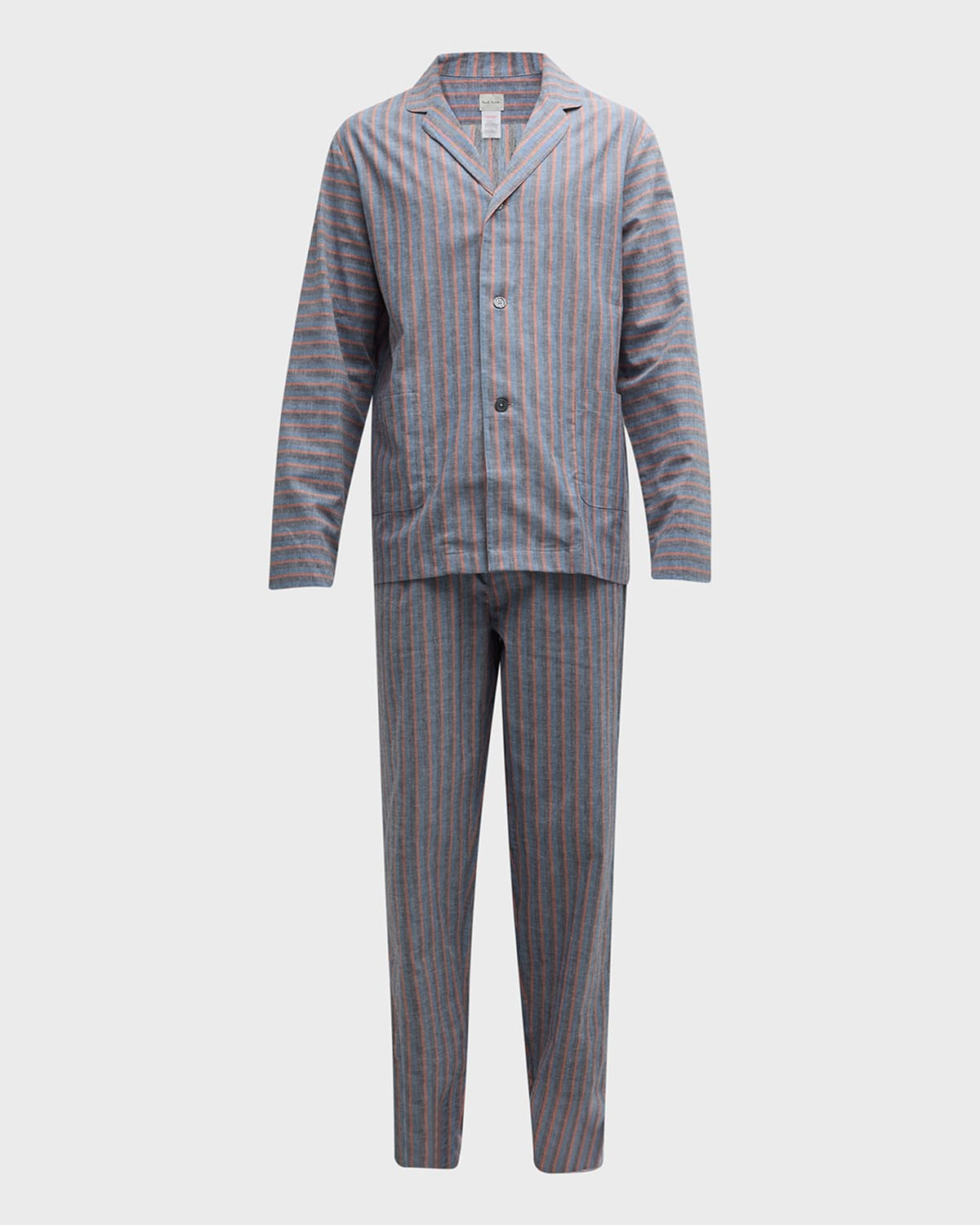 - Paul Smith two-piece pajama set with a multi-stripe print - Notch collar; button front - Two front patch pockets - Long sleeves - Logo tab at the side seam - Full length - Relaxed fit - Cotton/linen - Machine wash cold - Imported - Model is 6'1"/185cm. - This product contains perfluoroalkyl and polyfluoroalkyl substances (PFAS). For more information, please visit the manufacturer’s website.