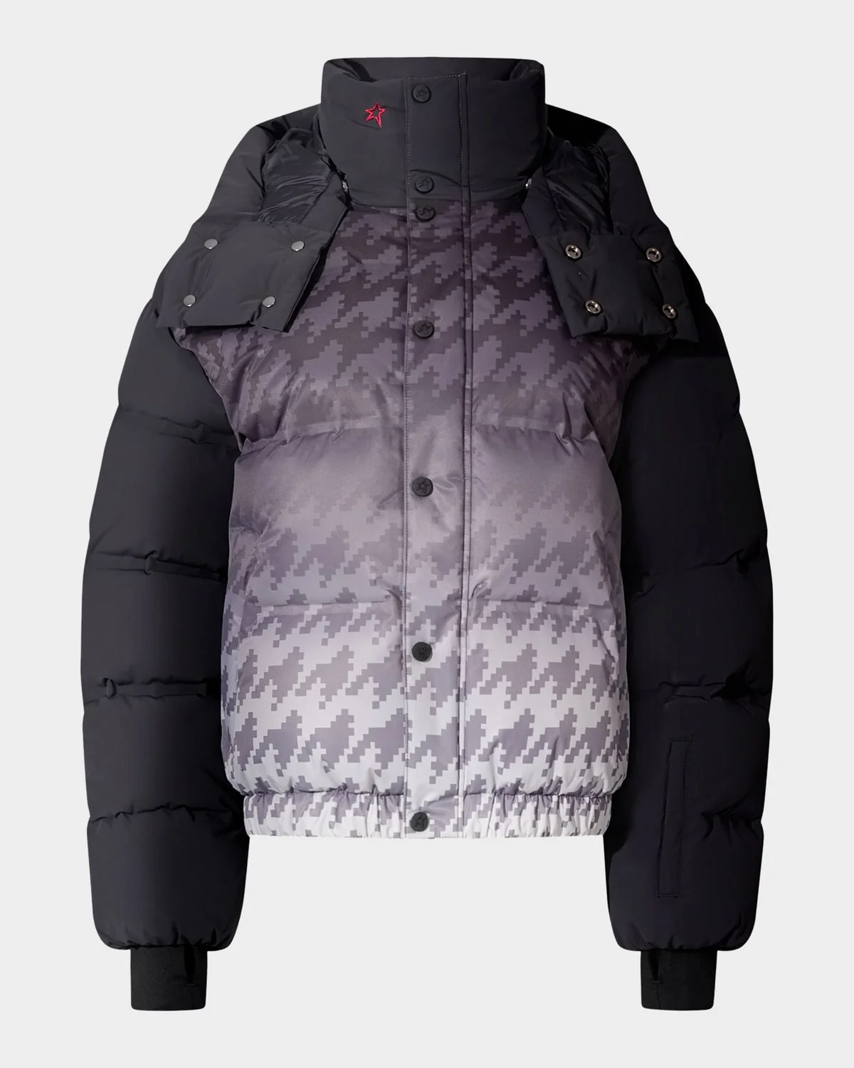 Crafted in waterresistant technical fabric, the "Moment" ski jacket by Perfect Moment combines ease with style, featuring a degrade houndstooth print and RECCO® technology allowing for unbeatable warmth and performance capabilities. Detachable helmetcompatible hood Stand collar Long sleeves with elastic wrist cuffs and thumbholes Exterior zip pockets; interior ski, chest, and goggle pockets Relaxed, oversized fit Adjustable snow skirt Elasticized hem Twoway zipfront with snapped storm placket Polyester/nylon/polyamide/spandex Fill: Down/feather Lining: Recycled polyester Machine wash cold, lay flat to dry. Do not dry clean. Imported