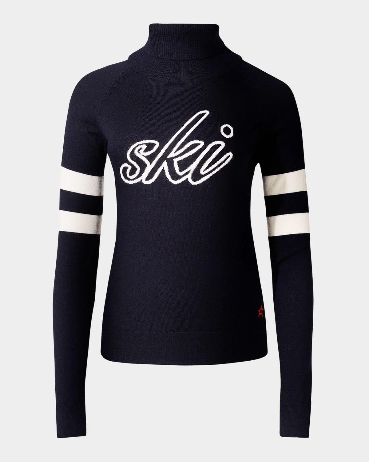 Crafted in soft merino wool, the "Neve" sweater by Perfect Moment features a bold intarsia and ribbed trim for layering on and off the slopes. Turtleneck Long sleeves Fitted Hem sits at the hip Pullover style Merino wool Hand wash cold Imported