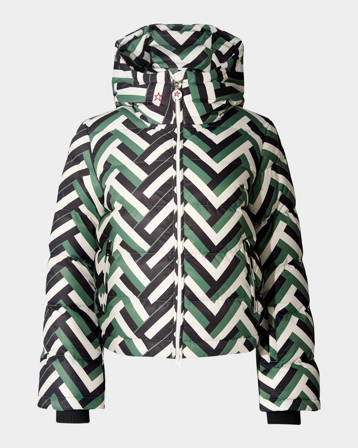 A signature Perfect Moment silhouette, the "Polar Flare" jacket, now in a bold Green Waffle print, features premium down insulation and RECCO® technology for ultimate on and offslope performance capabilities. Waterrepellent and breathable. High collar and helmetcompatible hood Long sleeves with knit cuffs Exterior zip and ski pass pocket; two interior pockets Slim, flared fit Cropped length Twoway zipfront with logo pulls Polyester/nylon/polyamide/polyurethane Fill: Down/feather Lining: Recycled polyester Machine wash cold, tumble dry low. Do not dry clean. Imported