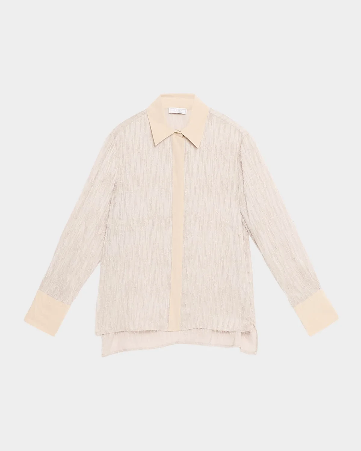 Peserico shirt crafted from fil coupe jacquard with crepe de chine eyelash trim Approx. 25"L from shoulder to hem Contrast finishes on collar, placket, and cuffs Point collar Long sleeves; approx. 23.0"L Dropped shoulders Side vents Relaxed fit Concealed button front Polyester/silk/elastane Dry clean Made in Italy