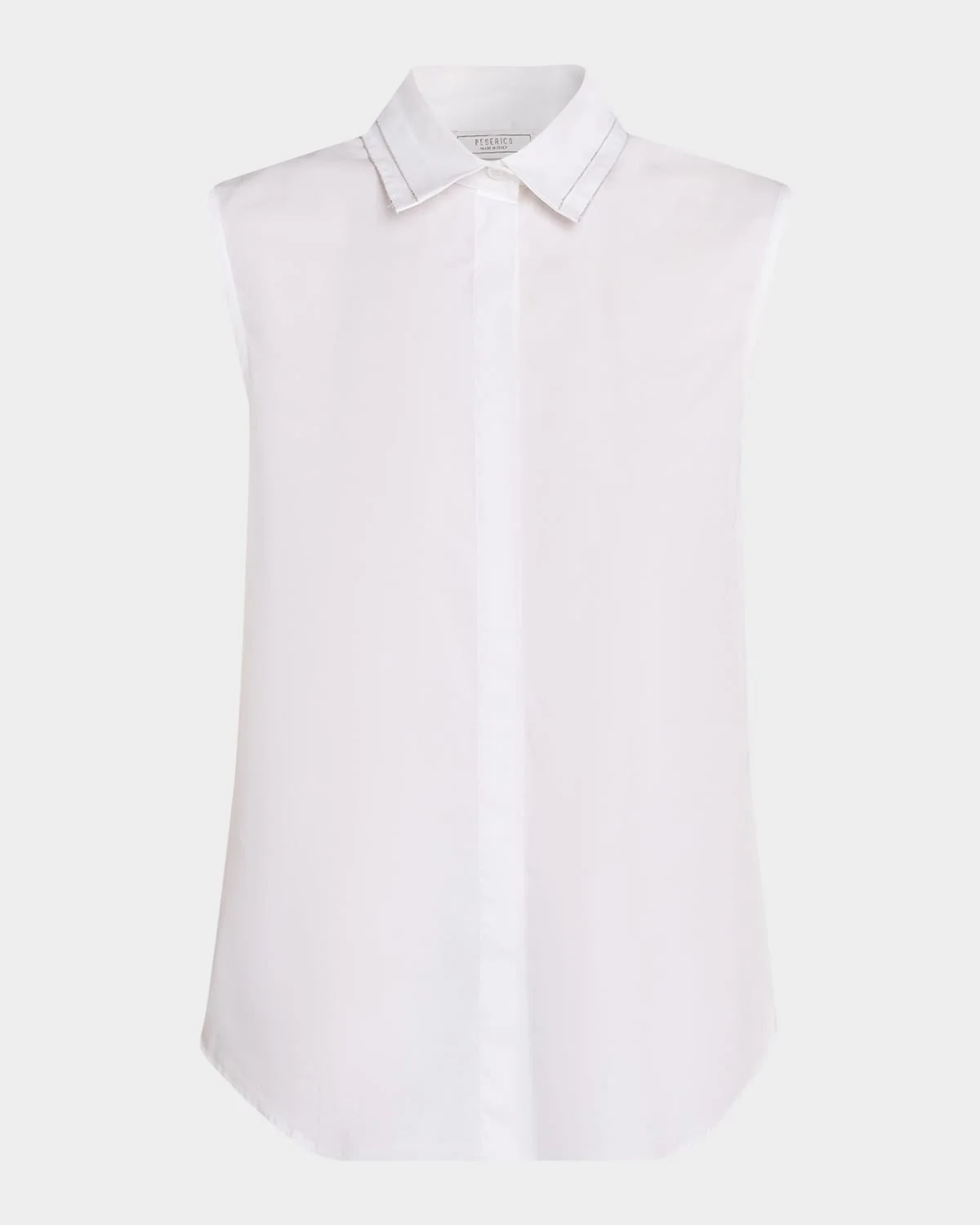 Peserico's sleeveless top pairs cotton poplin with a micro-rib stretch jersey yoke. The spread collar features Punto Luce detailing inserted on the pleats. Approx. 23.8" from shoulder to hem Spread collar Concealed button front placket Sleeveless Yoked back Side vents Cotton/elastane Dry clean, machine wash Made in Italy SIZE & FITPesericoModel measurements: 5'10" tallModel is wearing a US size 4/Small