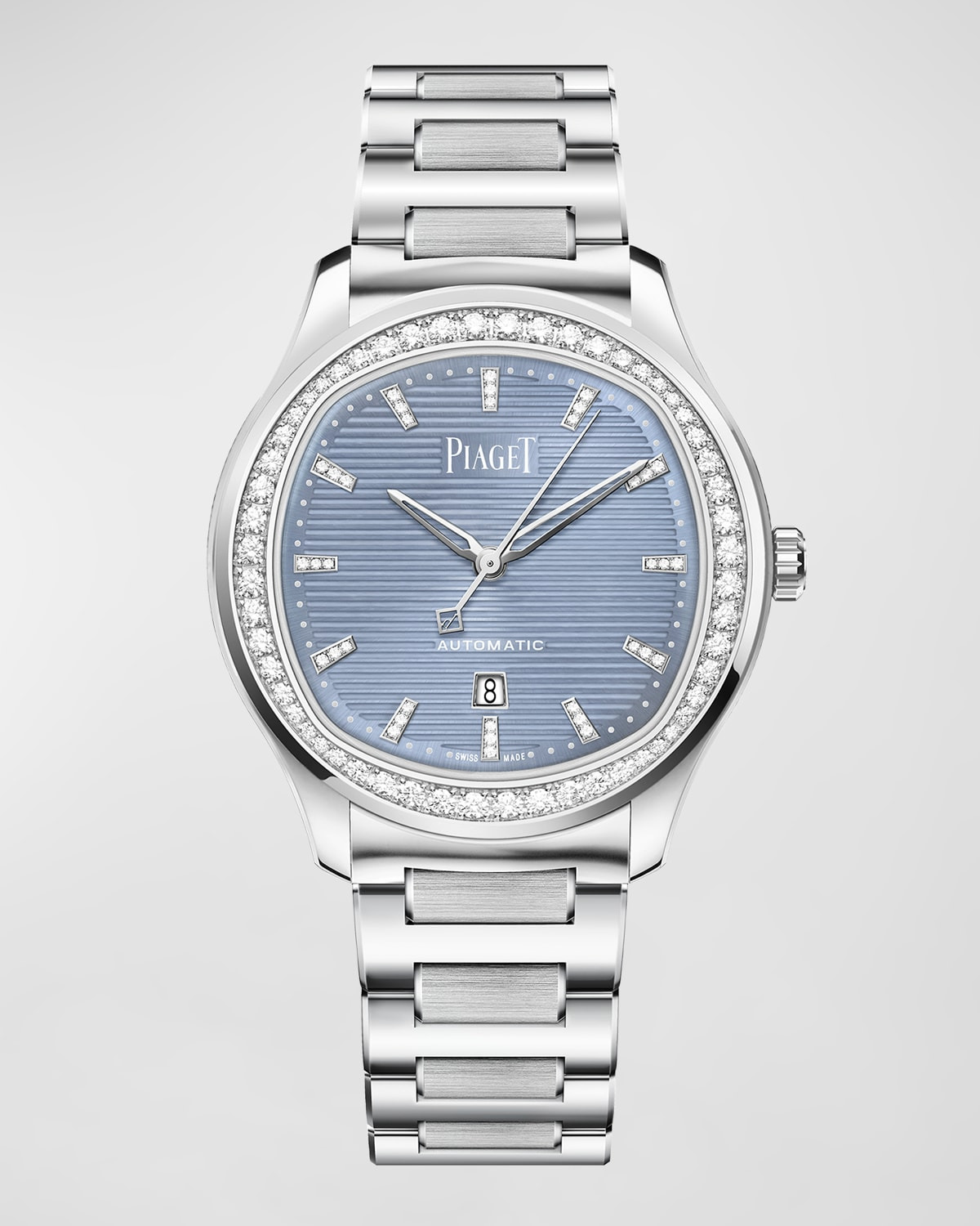 - PIAGET Polo watch - 36mm round stainless steel case with 60 brilliant-cut diamonds (approx. 0.97 carats) - Silvered slate blue dial with 36 brilliant-cut diamonds (approx. 0.08 carats) - Manufacture Piage 500P1 automatic mechanical movement - Date indicator at 6 o'clock - Sapphire crystal case back - Interchangeable strap with folding clasp - Made in Switzerland