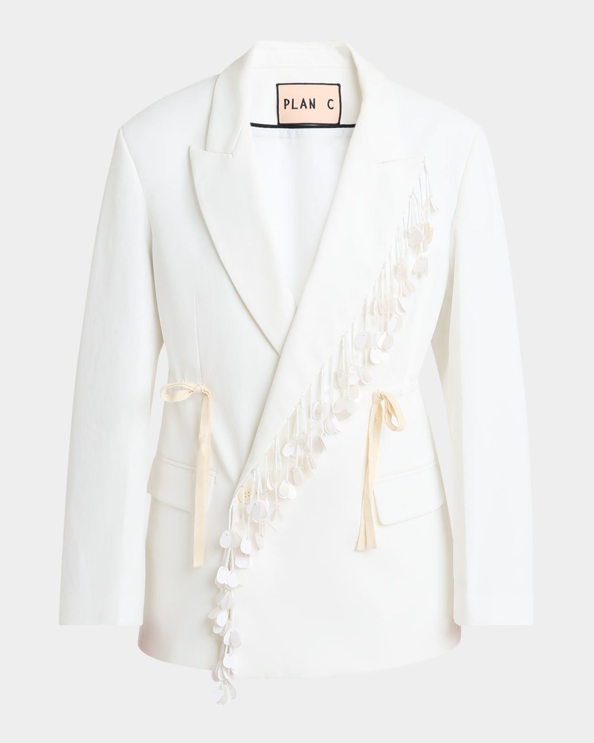 Plan C blazer jacket featuring sequin fringed lapel embellishment and drawstring cinched waist detail Peak lapels; doublebreasted front Long sleeves; button cuffs Side flap pockets Straight fit Polyester/cotton/linen Lining: Cotton/cupro Made in Italy