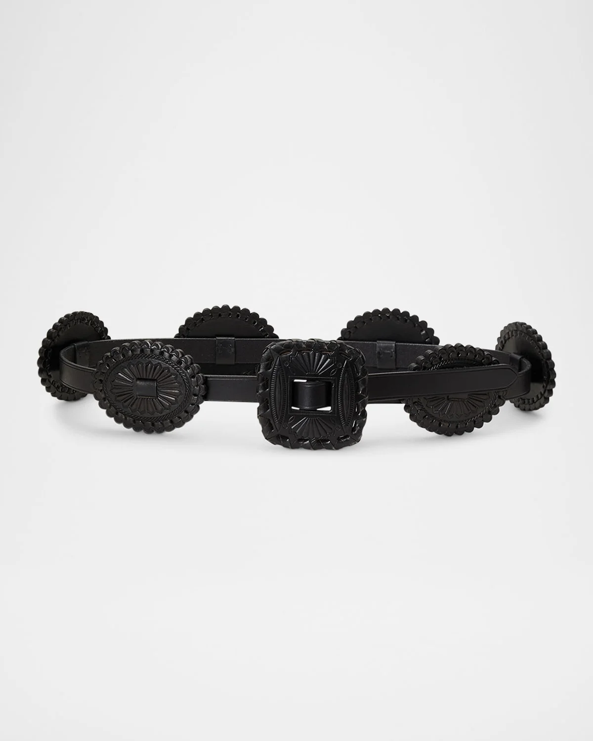 This western-inspired belt is updated for the season with each accent realized in the same supple leather as the belt strap. Leather buckle closure Adjustable fit Imported Size Note: XXS is 37" long XS is 39" long S is 41" long M is 43" long L is 45" long XL is 49" long