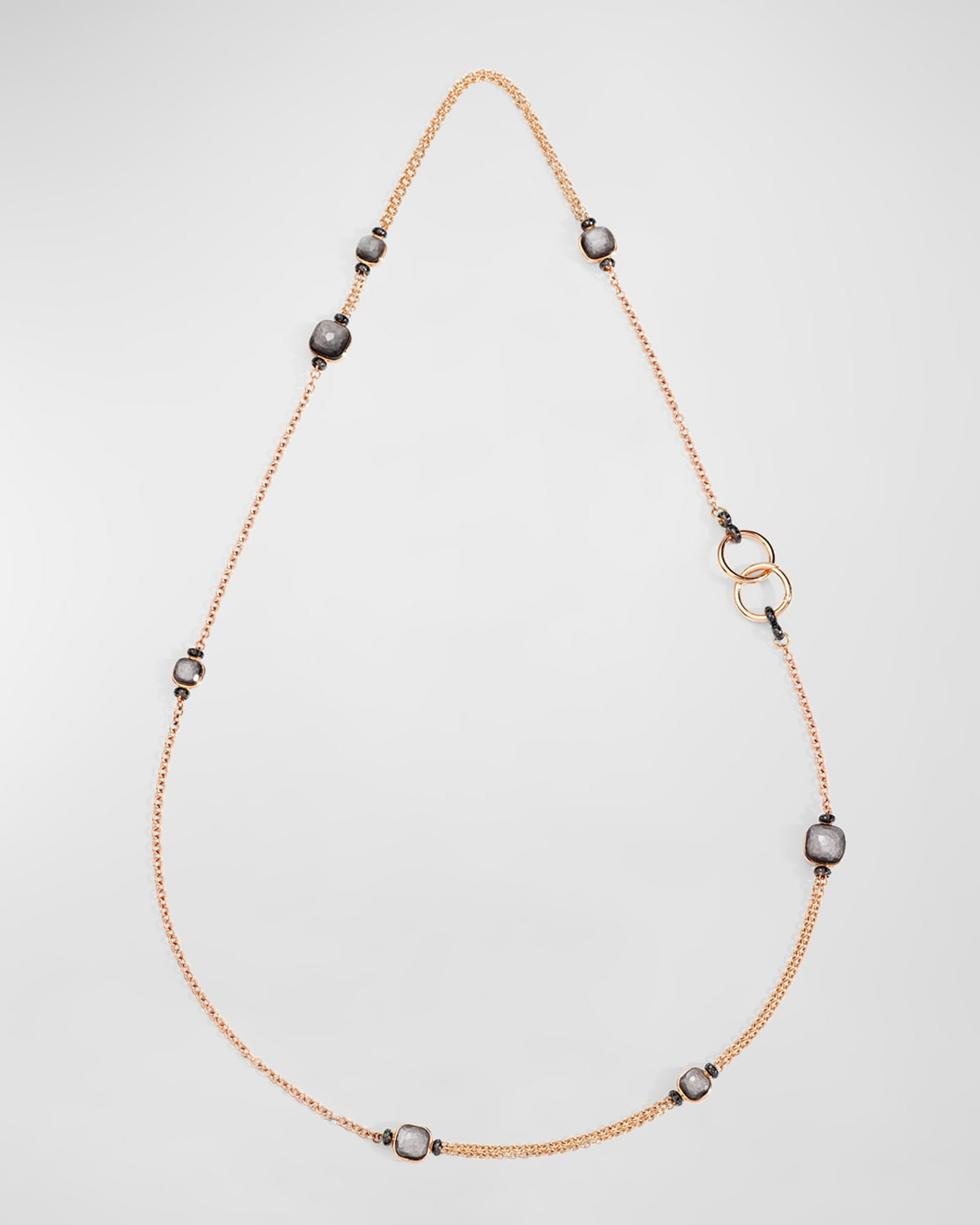 - Nudo sparkles in a brilliant sautoir design that may be worn in three different ways: a classic sautoir, a lariat pendant, or a double-wrap necklace. For the first time, Nudo’s stones feature the “Clessidra” (Italian for “hourglass”) double-face cut, leaving the gem more preciously nude than ever before. - Pomellato necklace from the Nudo Collection - 18-karat rose gold with a polished finish - Seven obsidians with 182 diamonds; 2.0 total diamond carat weight - Six sky blue topazes and one London blue topaz with 182 diamonds; 1.9 total diamond carat weight - 60.0 total obsidian carat weight - 69.0 sky blue topaz carat weight - 19.6 London blue topaz carat weight - Made in Italy - Nudo Collection - An endless surprise of color and style ready to stun, Nudo is the emblem of the modern ring every woman wants to own. - A smooth elegance sparked by seasonal trends and personal inspiration, the Nudo mixing & matching experience will only leave you longing for more.
