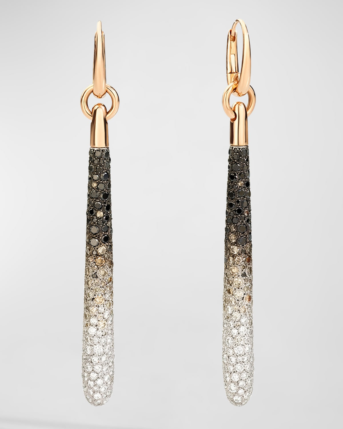 Pomellato earrings from the Sabbia Collection Polished 18karat rose gold and white gold 226 white diamonds on 18karat rhodiumplated white gold 198 brown diamonds on 18karat black rhodiumplated white gold 182 black diamonds treated on 18karat black rhodiumplated white gold 5.1 white diamond carat weight 4.6 brown diamond carat weight 4.3 black diamond carat weight For pierced ears Made in Italy