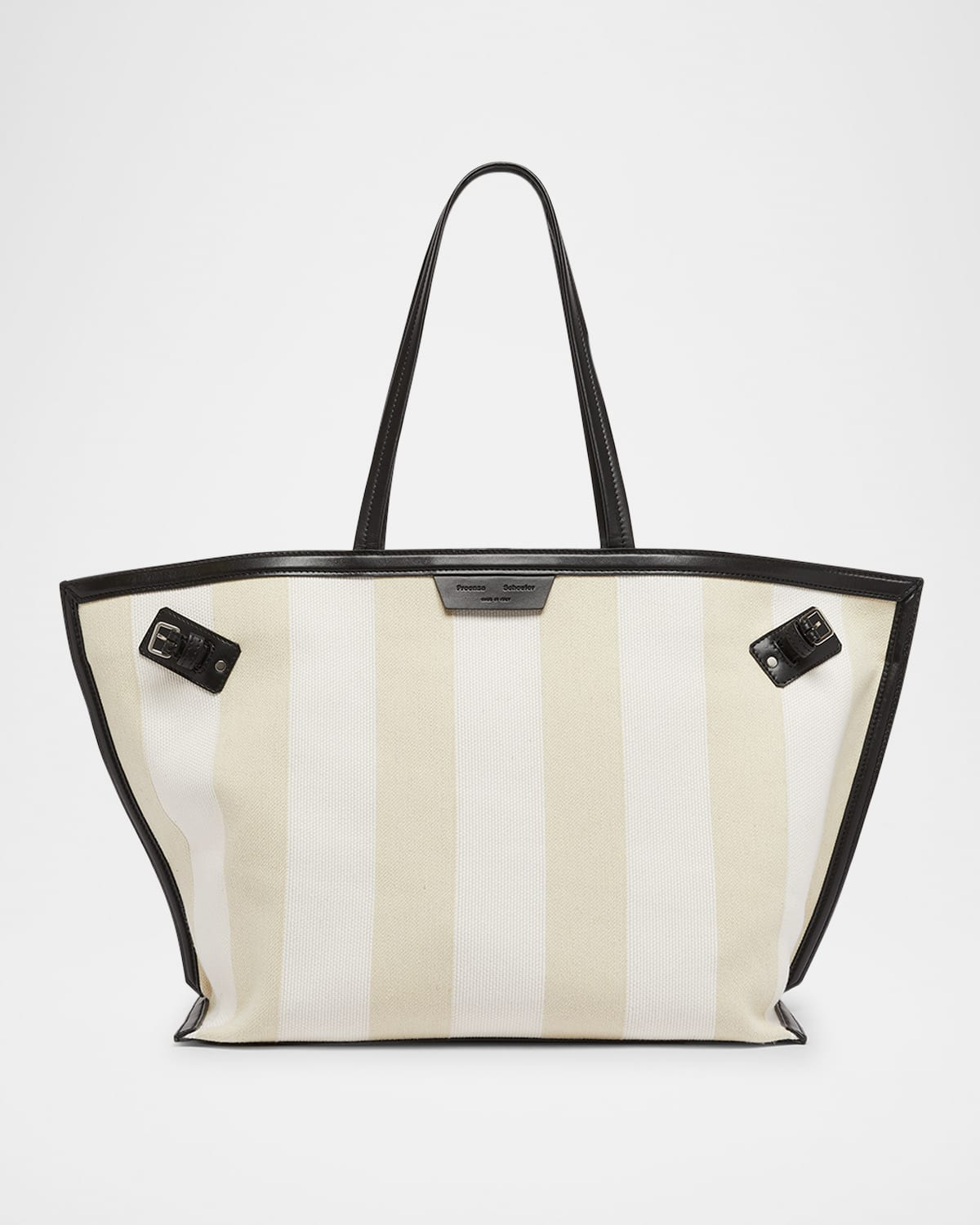 - Proenza Schouler "Days" striped canvas tote bag with leather trim - Shoulder straps, 10"L - Open top with magnetic and side buckle strap closures - Interior, one zip pocket, two slip pockets - Approx. 11.6"H x 23.2"W x 8.6"D - Viscose - Professional cleaning recommended - Made in Italy