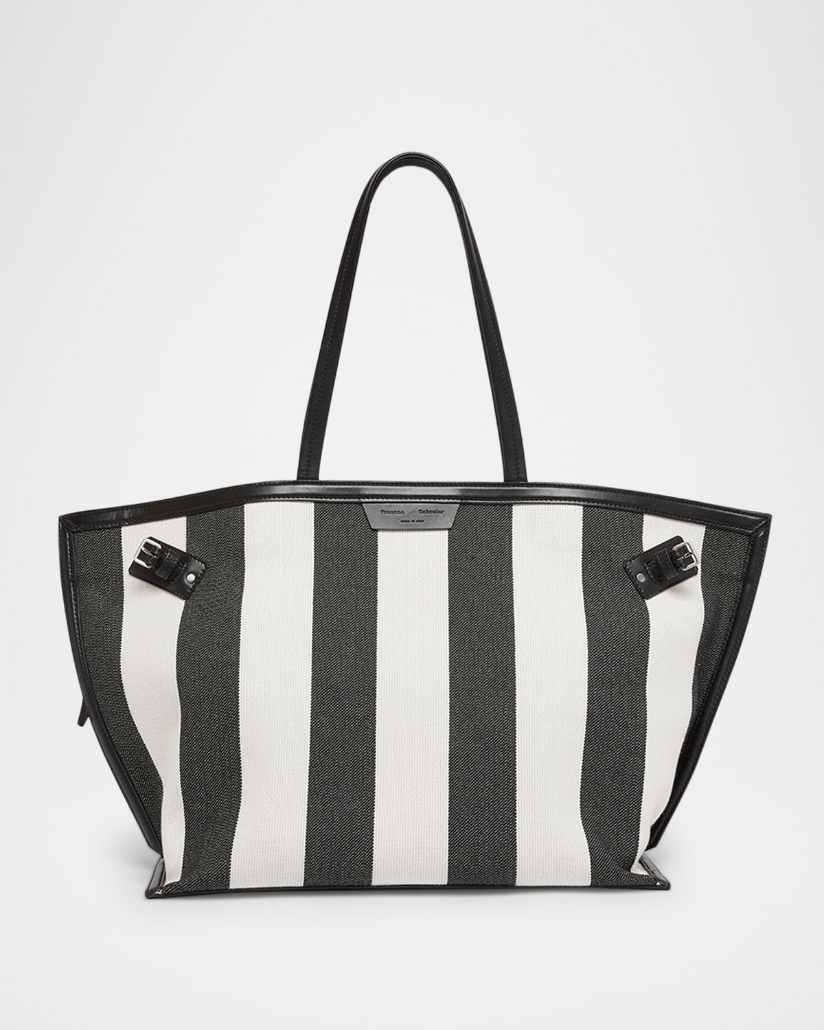 - Proenza Schouler "Days" striped canvas tote bag with leather trim - Shoulder straps, 10"L - Open top with magnetic and side buckle strap closures - Interior, one zip pocket, two slip pockets - Approx. 11.6"H x 23.2"W x 8.6"D - Viscose - Professional cleaning recommended - Made in Italy