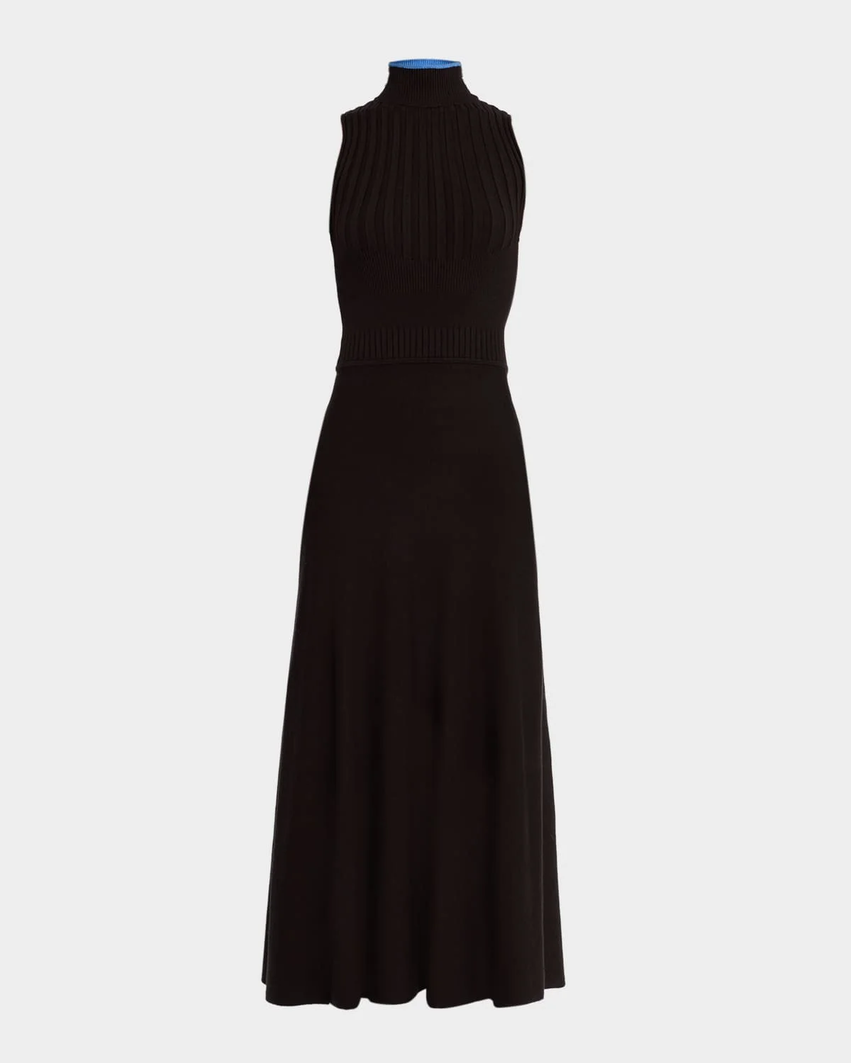 Proenza Schouler "Ezme" ultra-soft compact knit midi dress & nbsp;detailed with stripes and contrast trim & nbsp; Turtleneck & nbsp; Sleeveless Fit-and-flare silhouette Hem falls below the knee Slipover style & nbsp; Viscose/polyester Dry clean & nbsp; Imported SIZE & FITModel measurements: 5 & apos;10" tallModel is wearing a US size 4/Small
