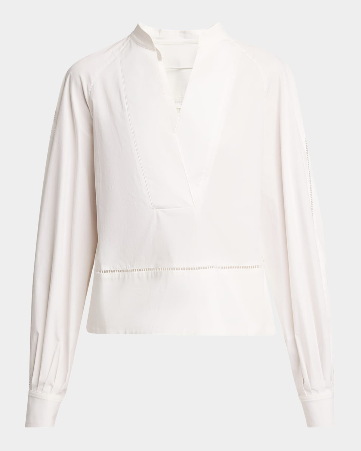 - Proenza Schouler "Grayson" top crafted from eco cotton poplin, accented with delicate ladder stitching - Stand johnny collar - Long sleeves; button cuffs - Boxy fit - Slip-on closure - Cotton/elastane/polyester - Dry clean - Made in Portugal