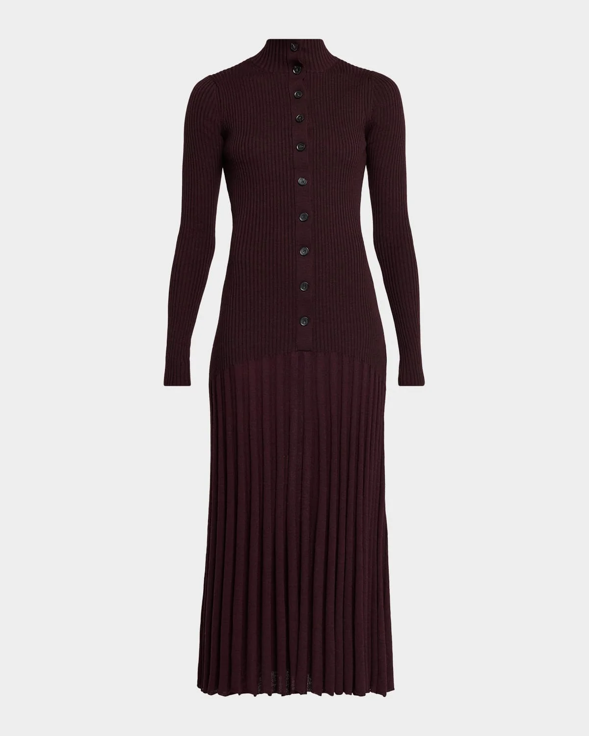 Proenza Schouler "Jada" dress is crafted of a bodyskimming ribbed knit that transitions into a flowy pleated knit skirt Turtleneck; button front Elongated long sleeves Drop waist Bodyskimming silhouette Full length Slipover style Merino wool Dry clean Imported