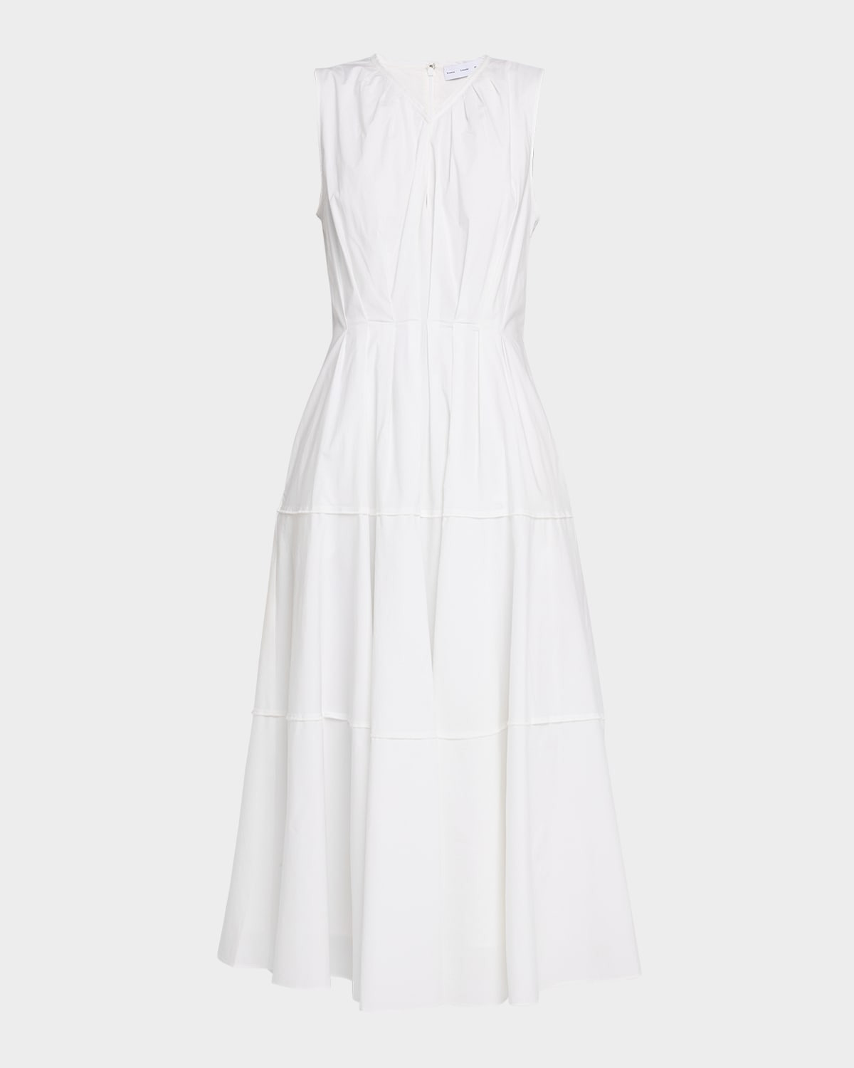 - Proenza Schouler White Label "Kailey" stretch poplin maxi dress featuring a pintuck waist - V neckline; button closure - Sleeveless - A-line silhouette - Hem falls below the knee - Invisible back zip - Cotton/spandex - Dry clean - Imported