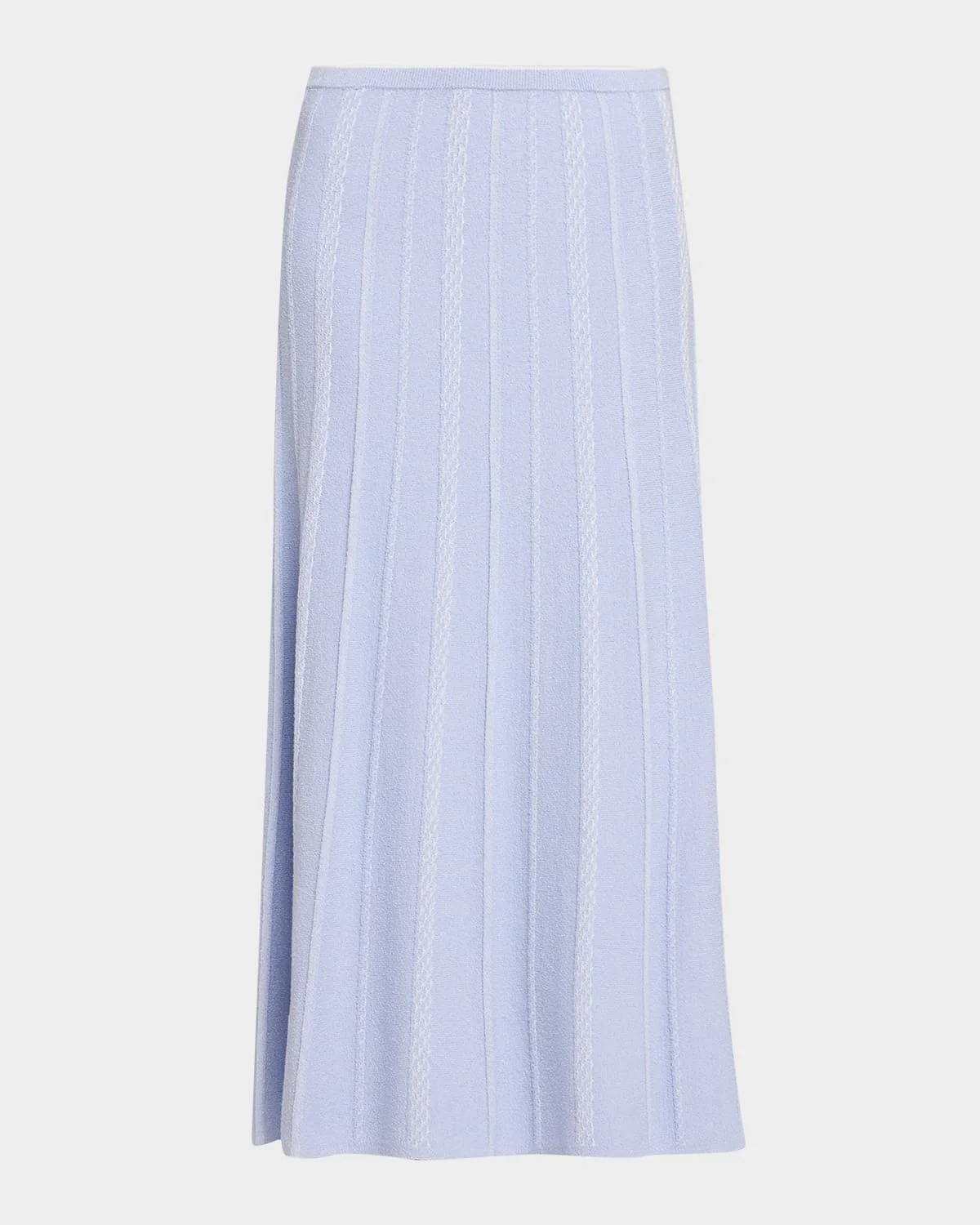 Proenza Schouler White Label "Morena" midi skirt crafted from textured knit with a subtle stripe motif & nbsp; High rise Elastic waistband & nbsp; A-line silhouette Hem falls below the knee Pull-on style & nbsp; Viscose/silk/nylon/polyamide Dry clean Imported SIZE & FITModel measurements: 5 & apos;10" tallModel is wearing a US size 4/Small