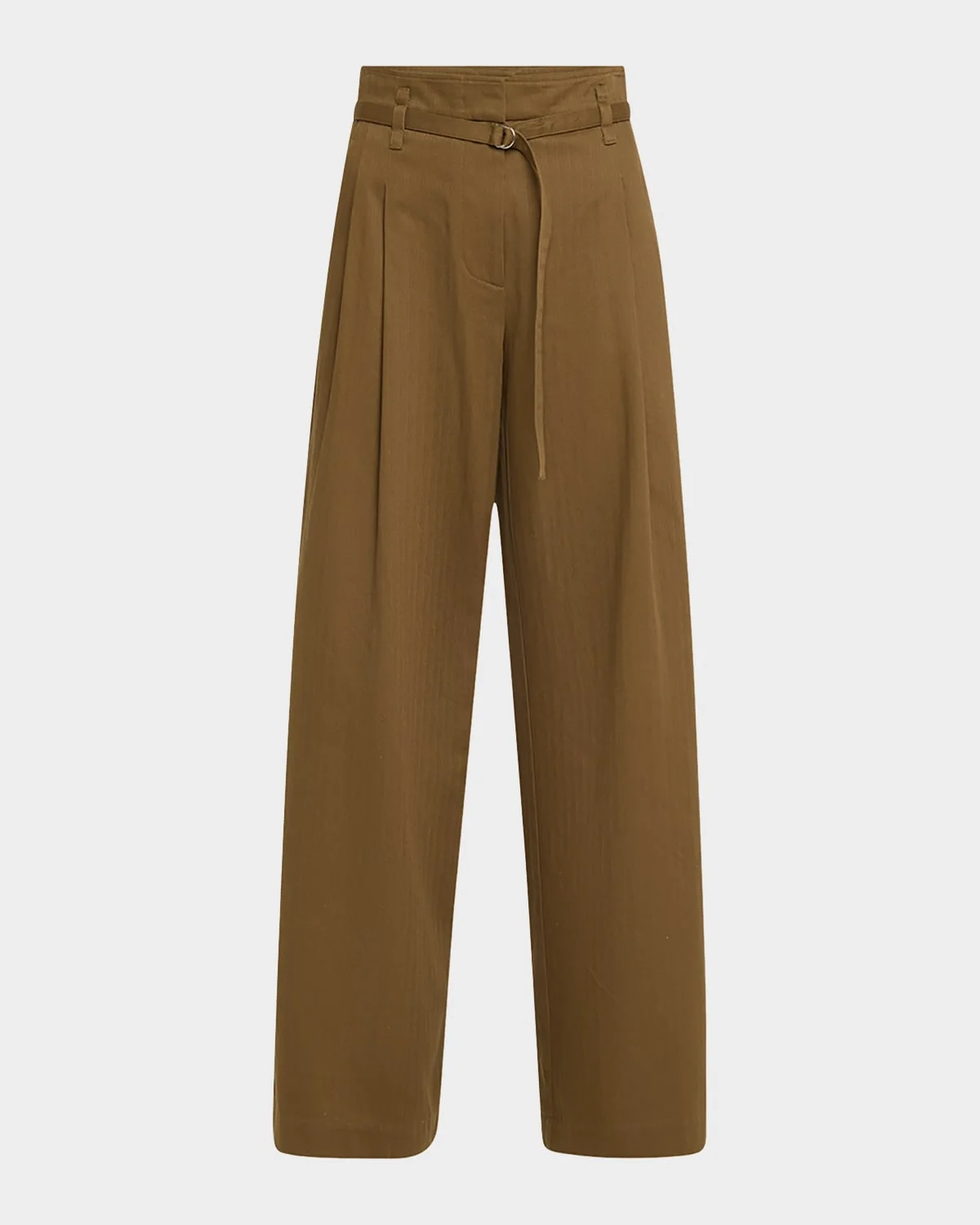 - Proenza Schouler White Label "Raver" cotton pants in fine herringbone - High rise - Adjustable D-ring belt - Side slip pockets; back patch pockets - Pleated front - Wide legs - Full length - Hook/zip fly; belt loops - Cotton/spandex - Dry clean - Imported