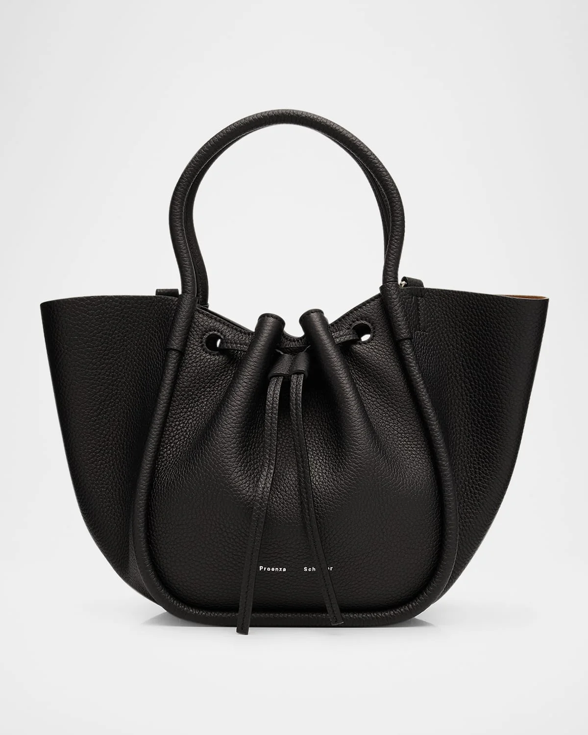 This small ruched tote bag from Proenza Schouler is crafted of grained calf leather and finished with the foiled logo on the front for a subtle elegance. Rolled top handles; 5.1" drop each Detachable, adjustable leather crossbody strap Drawstring and magnetic closure Approx. 9"H x 13.4"W x 6.5"D Made in Italy