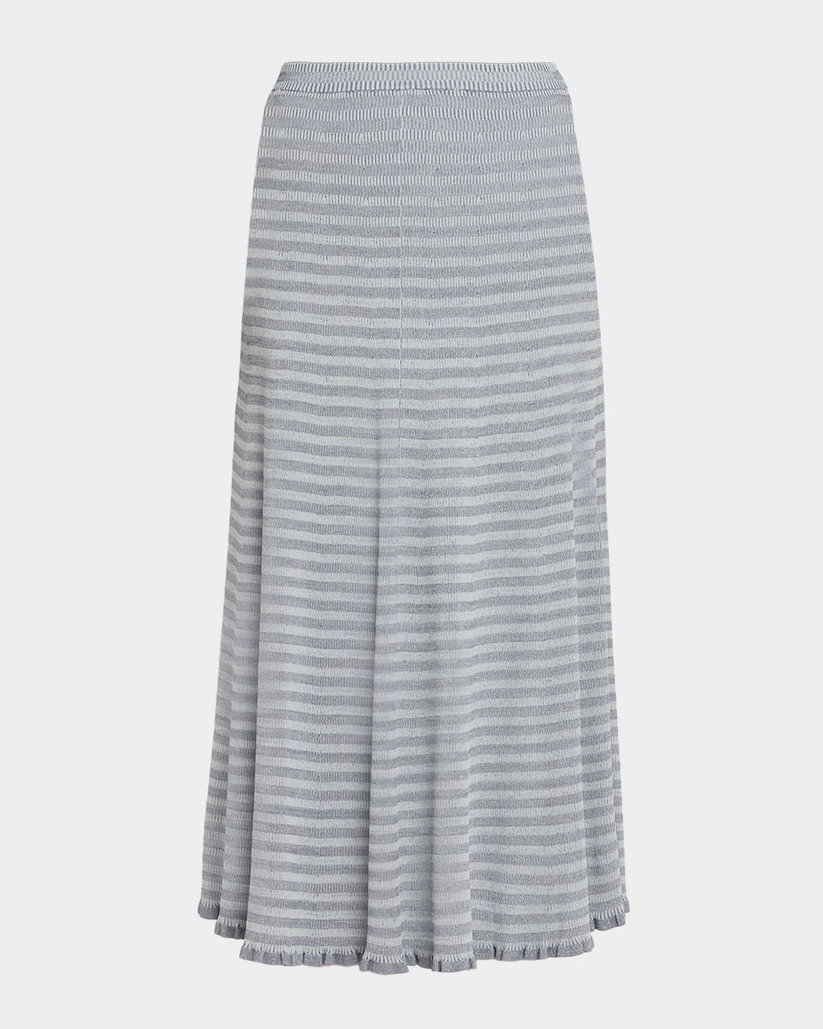 Crafted from geometric knit, the "Stina" skirt by Proenza Schouler White Label features an elastic waistband for comfort with delicate ruffle trim. High rise Aline silhouette Hem falls below the knee Pullon style Rayon/cellulose acetate Dry clean Imported