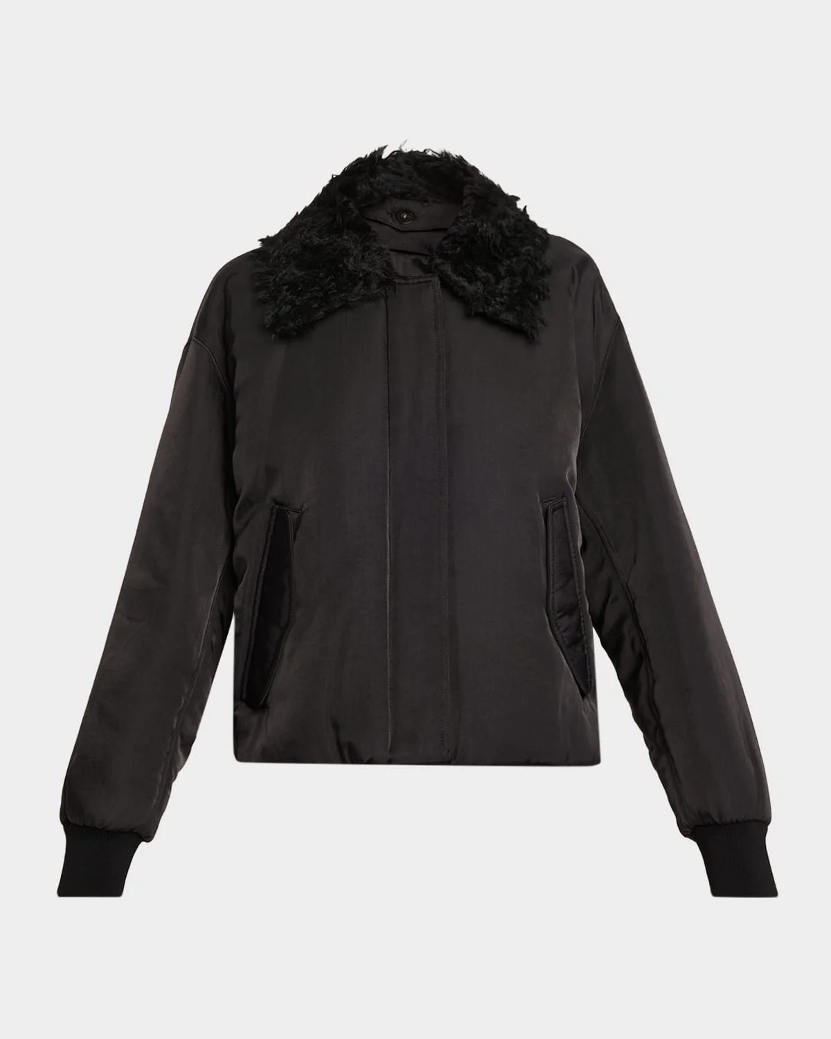 Crafted in nylon, the "Vadra" jacket by Proenza Schouler White Label features a faux shearling collar, adding a chic touch to a classic silhouette. Spread collar Dropped shoulders Long sleeves with ribknit cuffs Side flap pockets Relaxed fit Hem sits at the hip Zipfront with snapover placket Nylon/polyamide/mohair Lining: Faux shearling Dry clean only Made in Poland