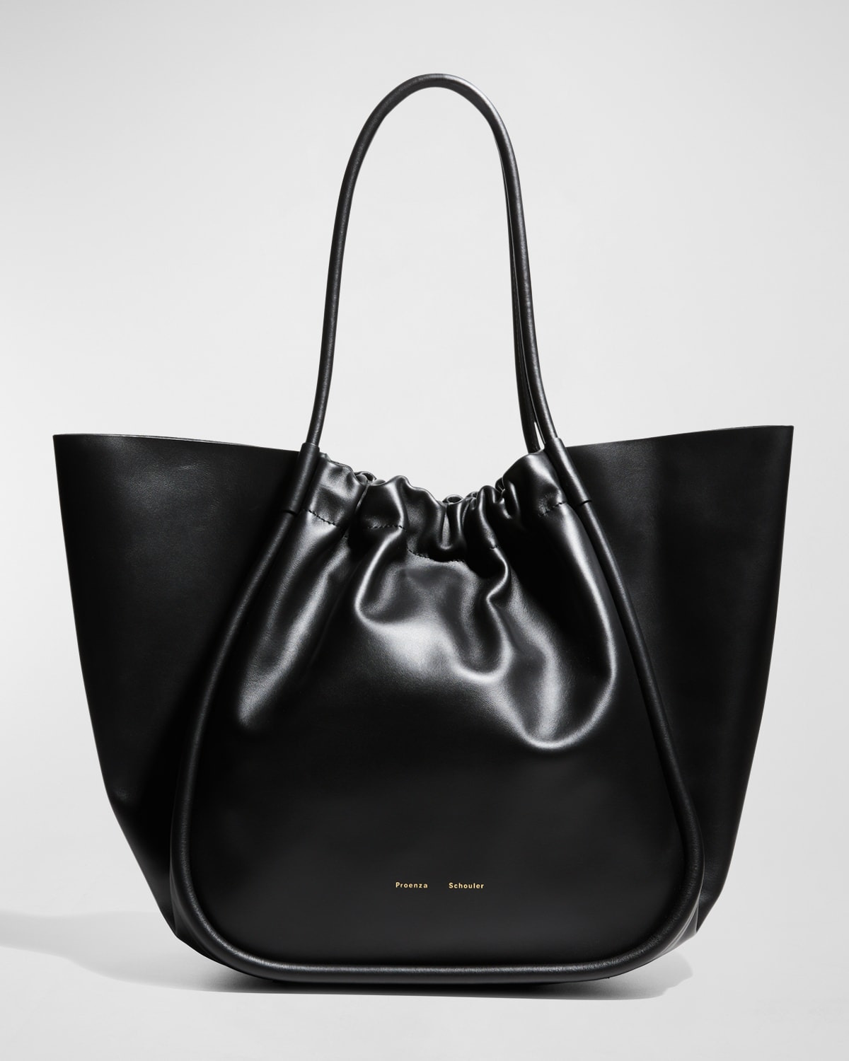 - Proenza Schouler smooth two-tone leather tote bag. - Tubular top handles; ruching at base. - Open top with magnetic closure. - Interior, contrast leashed zip pouch. - 17"H x 26"W x 12"D. - Made in Italy.