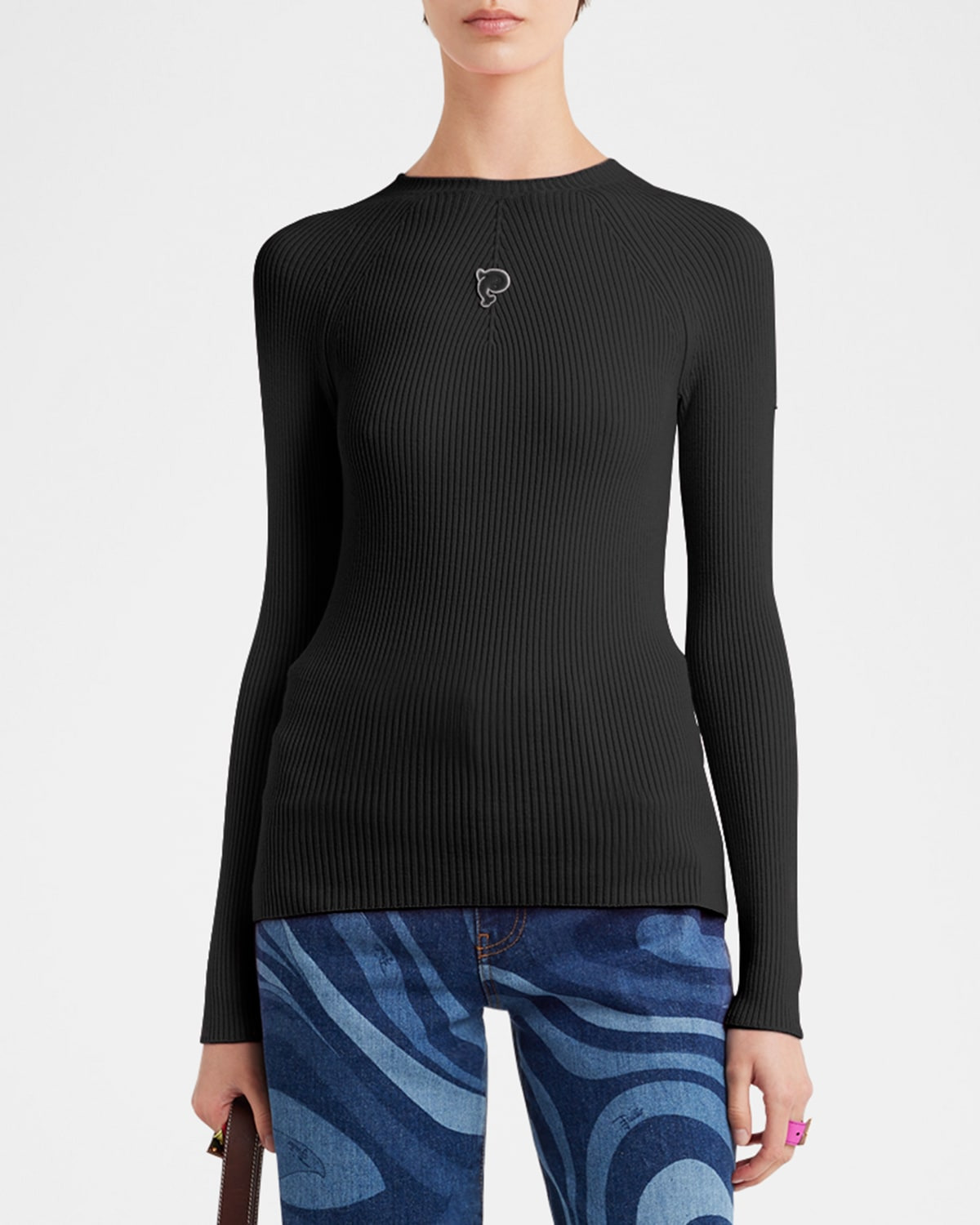 - Emilio Pucci top in fine wool lycra vanise rib with a logo patch chest - Crew neckline - Long raglan sleeves - Fitted - Pullover style - Wool/Lycra® spandex - Made in Italy - Model is 5'10"/177cm.