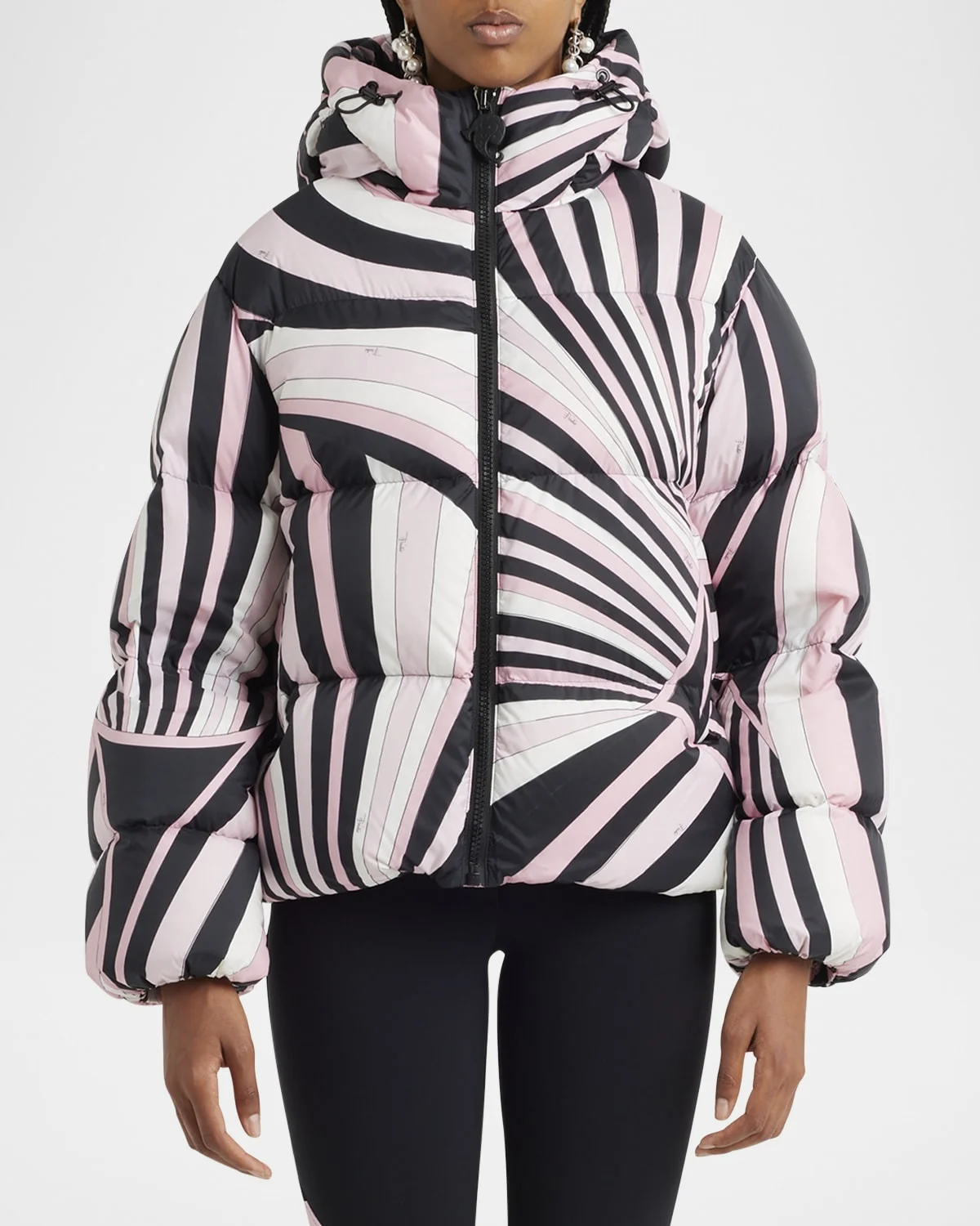 Emilio Pucci ski jacket featuring signature archival Iride print and logo pull tab Drawstring hooded neckline; zip front Long sleeves; thumbhole cuffs Concealed side zip pockets Regular fit Hip length Adjustable hem Nylon/polyamide Fill: Feather/Down Made in Italy