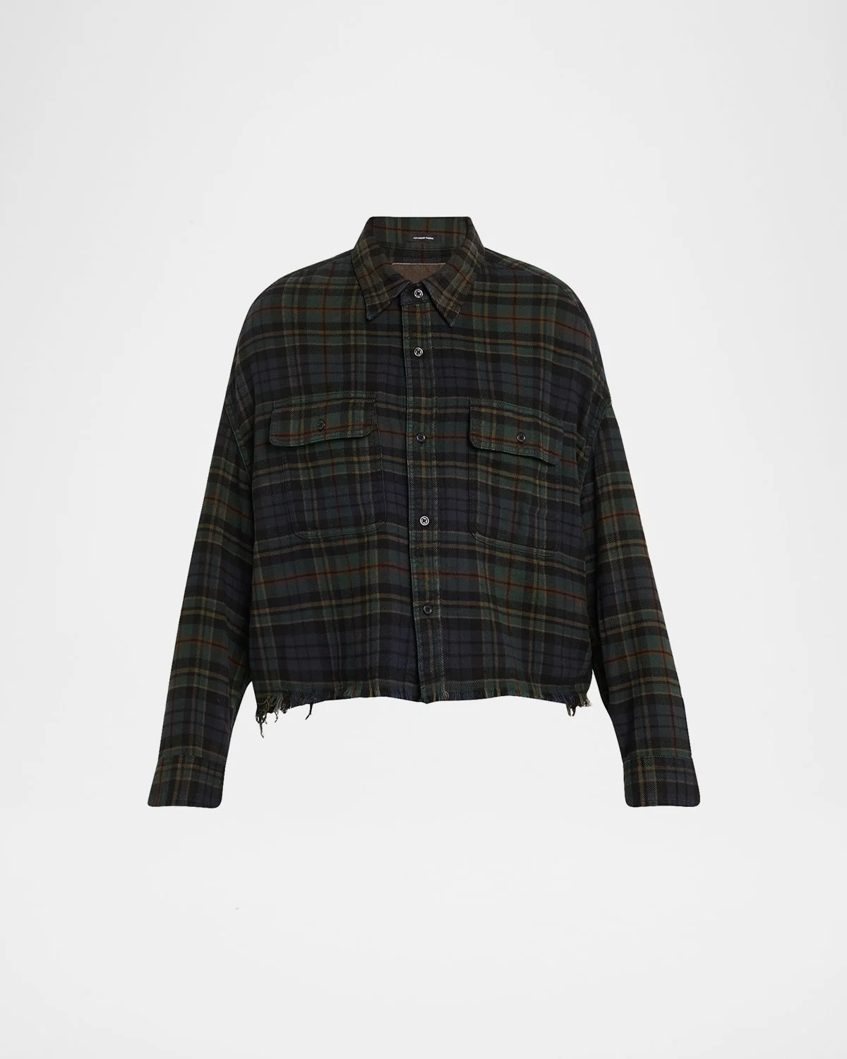 R13 plaid print work shirt finished with frayed trim & nbsp; Point collar Dropped shoulders Long sleeves with button cuffs Dual chest pockets & nbsp; Relaxed fit Cropped length Button-front & nbsp; Cotton Dry clean & nbsp; Imported