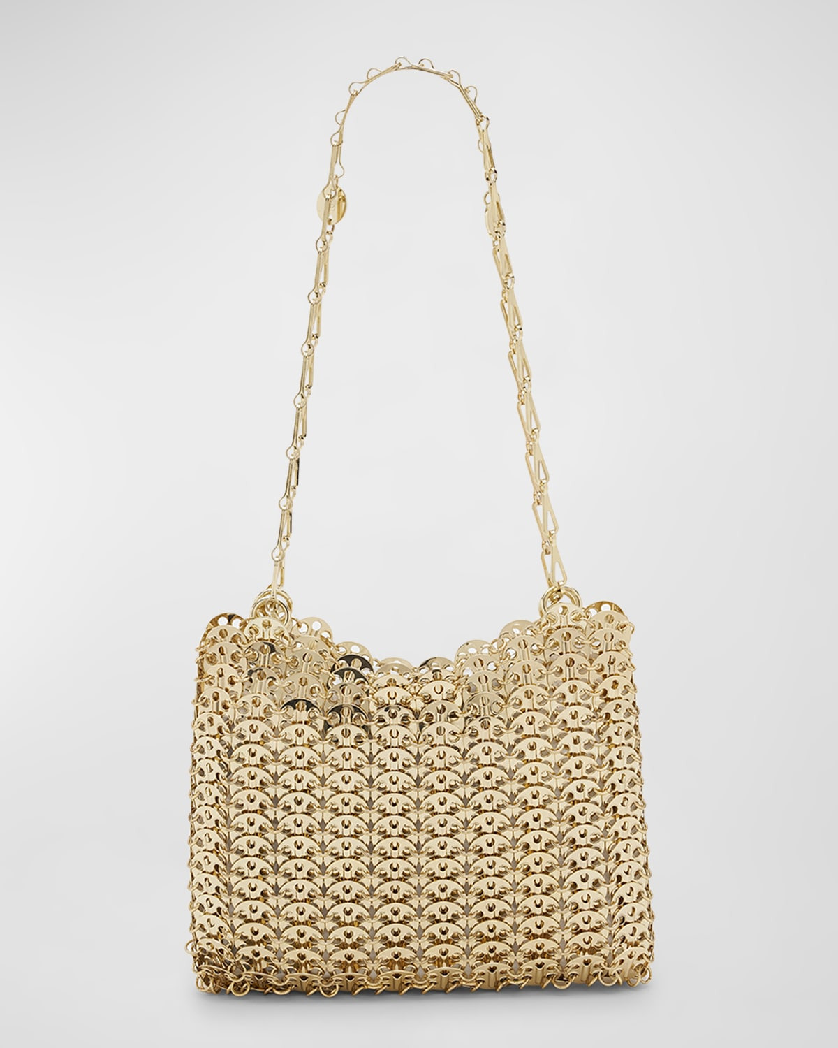 - Paco Rabanne "1969" shoulder bag in disc-link brass - Adjustable chain shoulder strap - Open top - Unlined - Approx. 5.9"H x 9.1"W x 1.2"D - Made in France