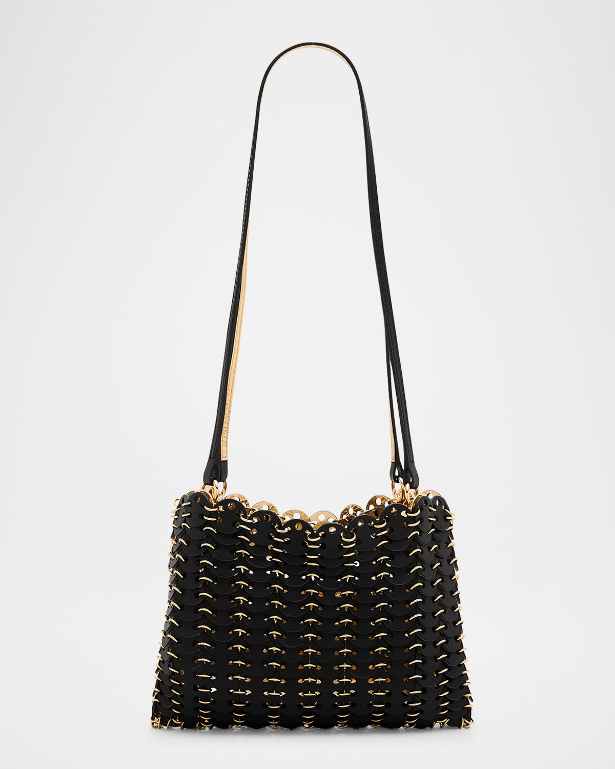- Rabanne "Sac a Main" reversible shoulder bag constructed with leather and metal discs - Detachable, reversible shoulder straps - Open top with logo-engraved magnetic closure - Approx. 7.1"H x 9"W x 1.2"D - Made in Hungary