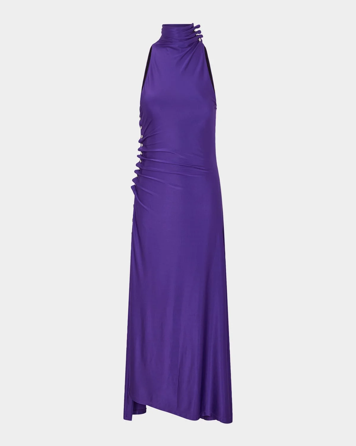 Crafted from satin viscose jersey, this dress from Rabanne features & nbsp;draped snap-fastening along the neck and waist Turtleneck Sleeveless A-line silhouette Hem falls below the knee Snap side closure Viscose/elastane Dry clean Made in Portugal SIZE & FITModel measurements: 5 & apos;10" tallModel is wearing a US size 4/Small