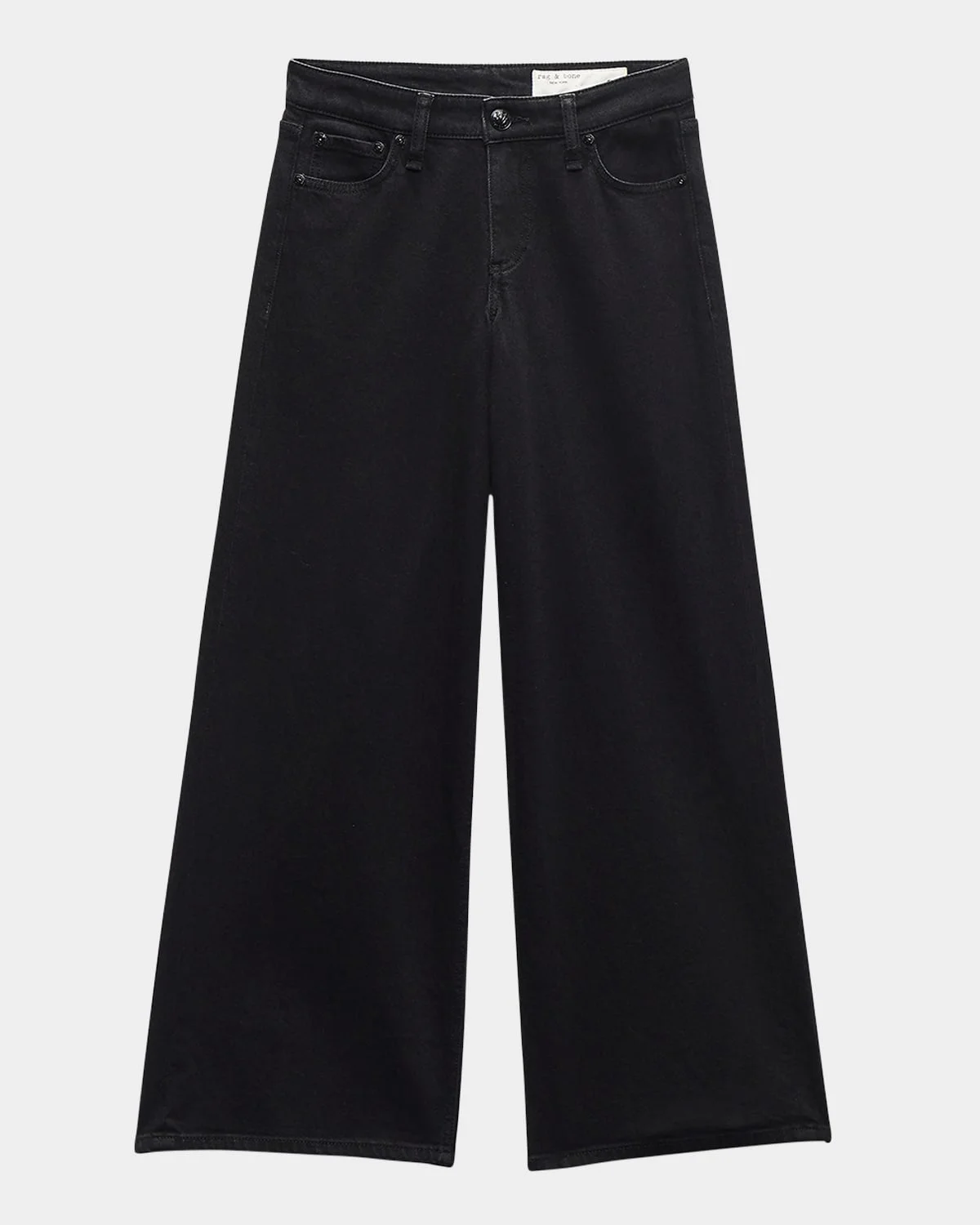- Rag & Bone "Aiden" wide-leg jeans in black denim - Approx. 9.3" rise; 30" inseam - Low-rise; sits at the hip - Five-pocket style - Relaxed fit - Full length - Button/zip fly; belt loops - Cotton/lyocell/viscose - Machine wash cold - Imported